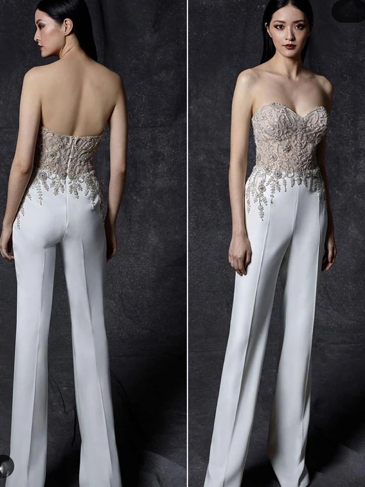 Белый комбинезон, Свадебные брюки, женские брюки, элегантные привлекательные офисные брюки с кристаллами и бисером, индивидуальный пошив