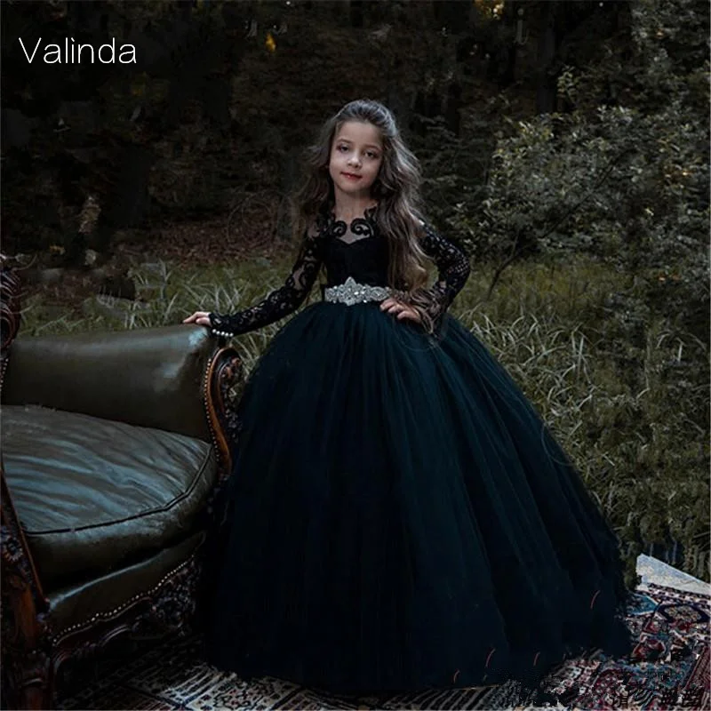 Одежда с длинным рукавом черного цвета для девочек в цветочек платья бальное платье Праздничное платье Вечерние