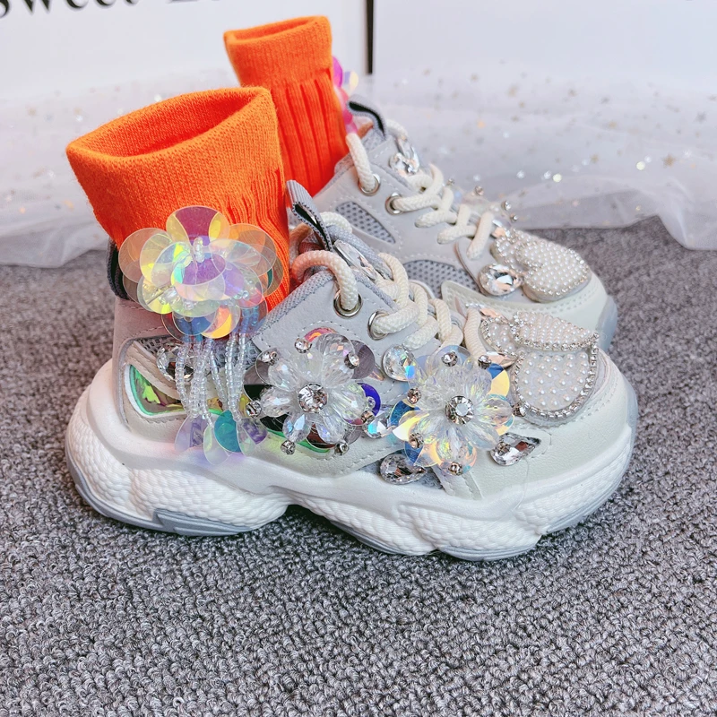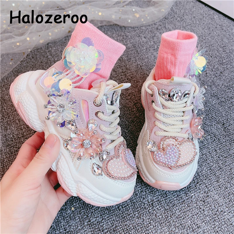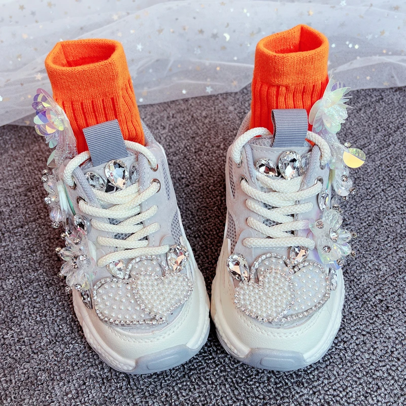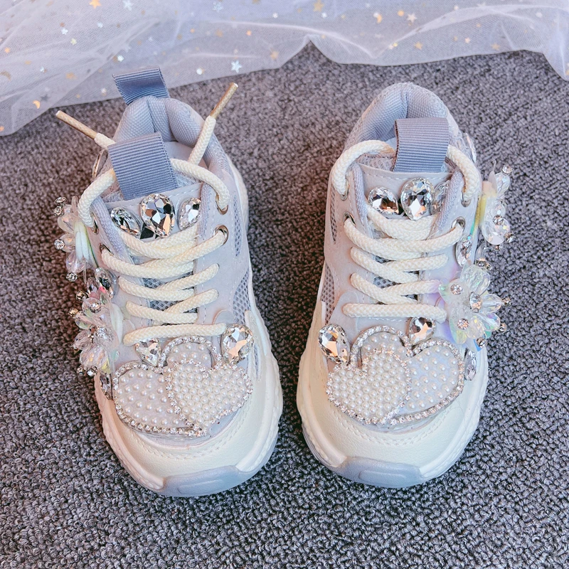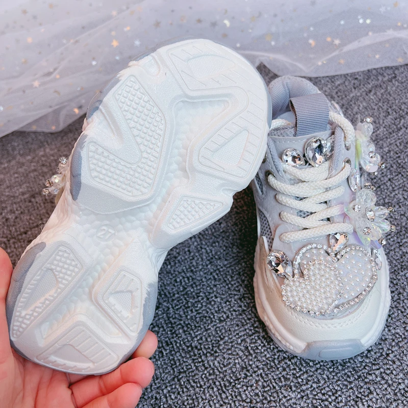 Новое Осеннее детское платье с рисунком в виде сердца, спортивные кроссовки, Сетчатое платье для маленьких девочек; Брендовая обувь; Детские стразы на резиновой подошве в повседневном стиле на не сужающемся книзу массивном кроссовки