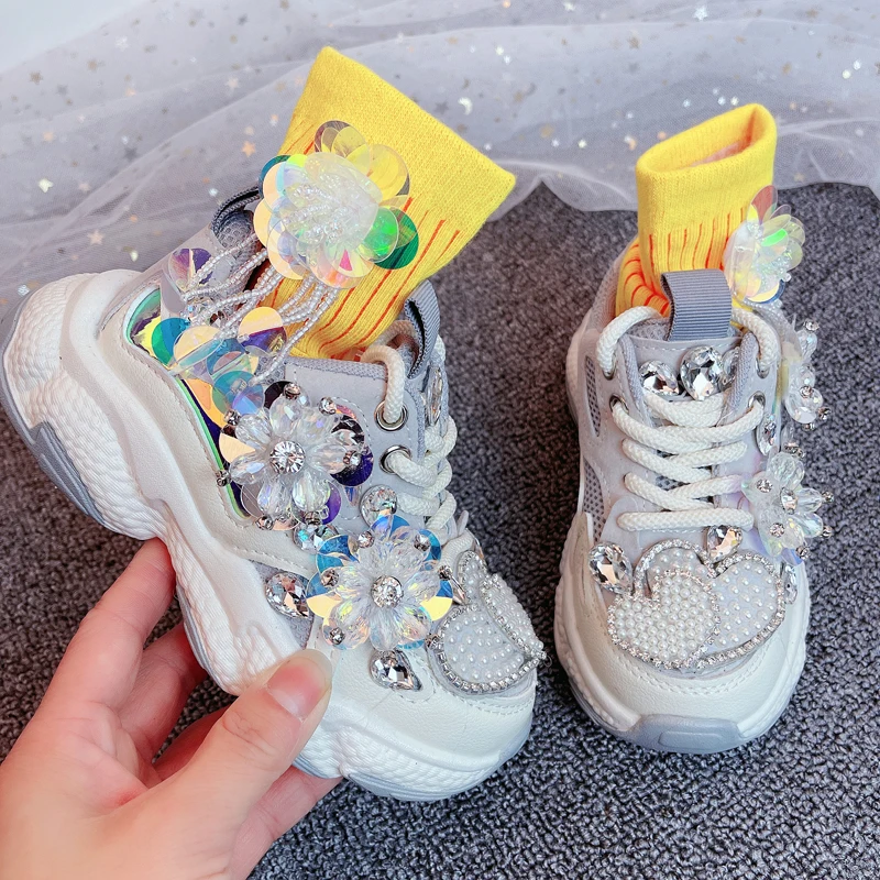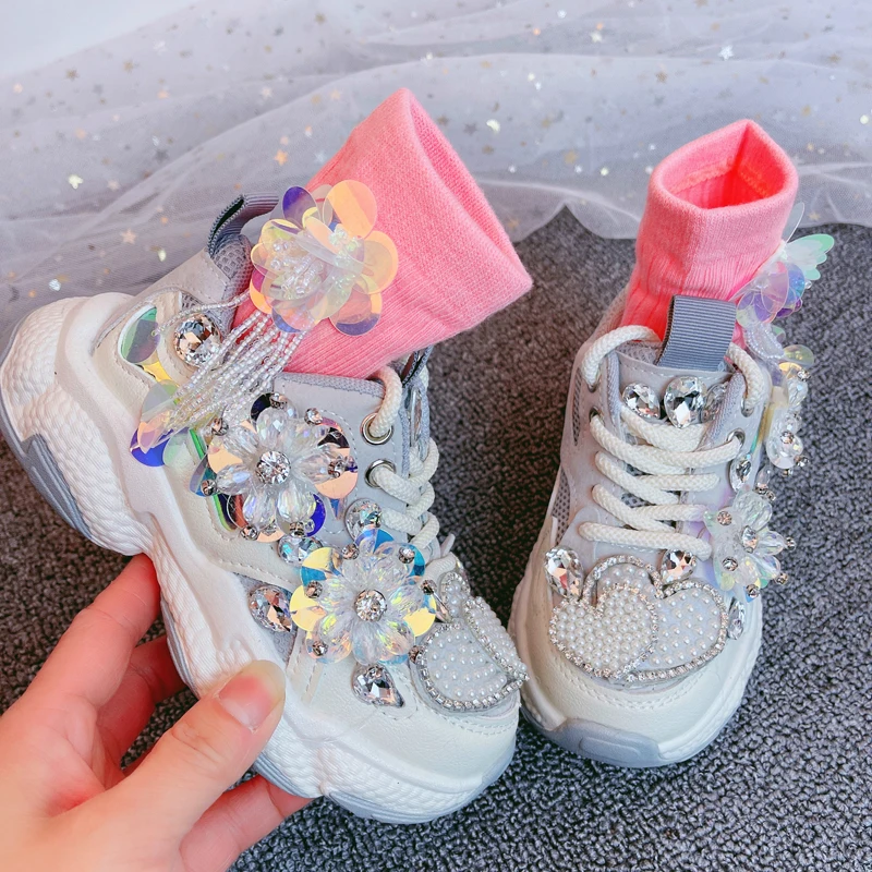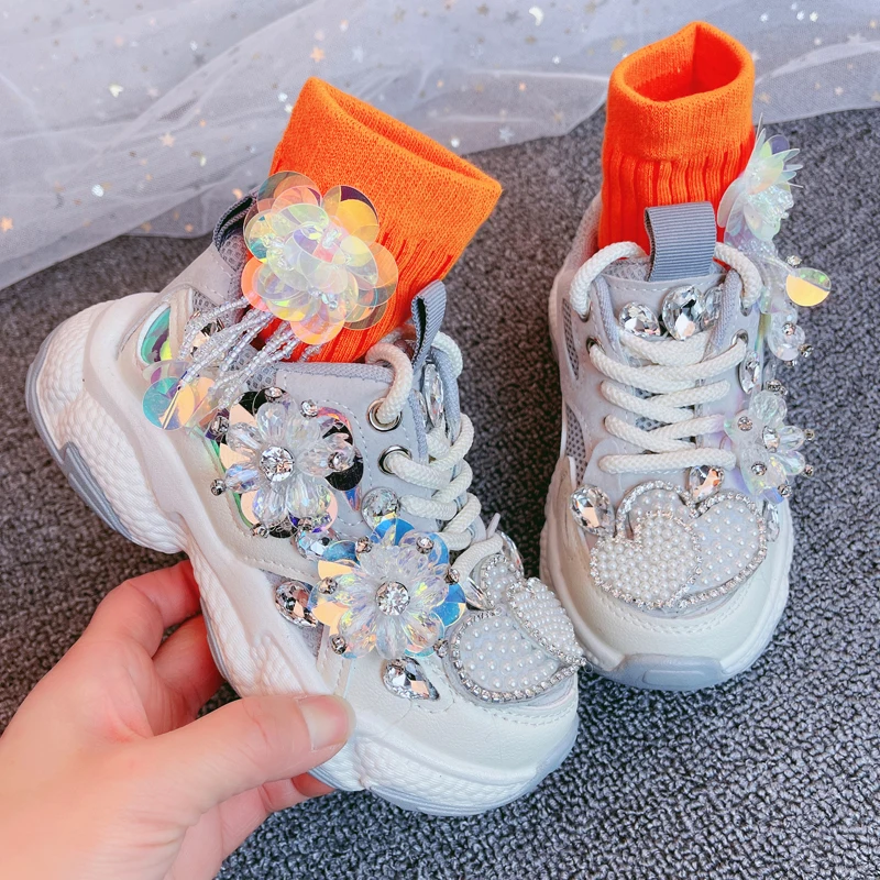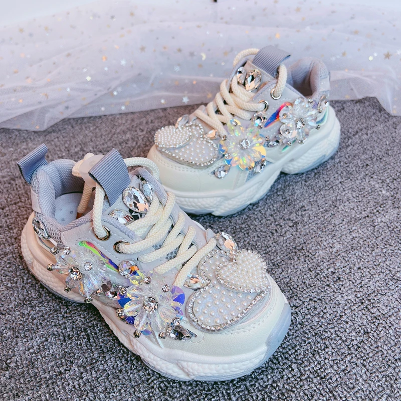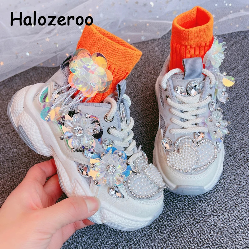 Новое Осеннее детское платье с рисунком в виде сердца, спортивные кроссовки, Сетчатое платье для маленьких девочек; Брендовая обувь; Детские стразы на резиновой подошве в повседневном стиле на не сужающемся книзу массивном кроссовки