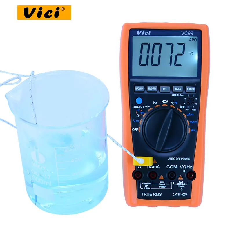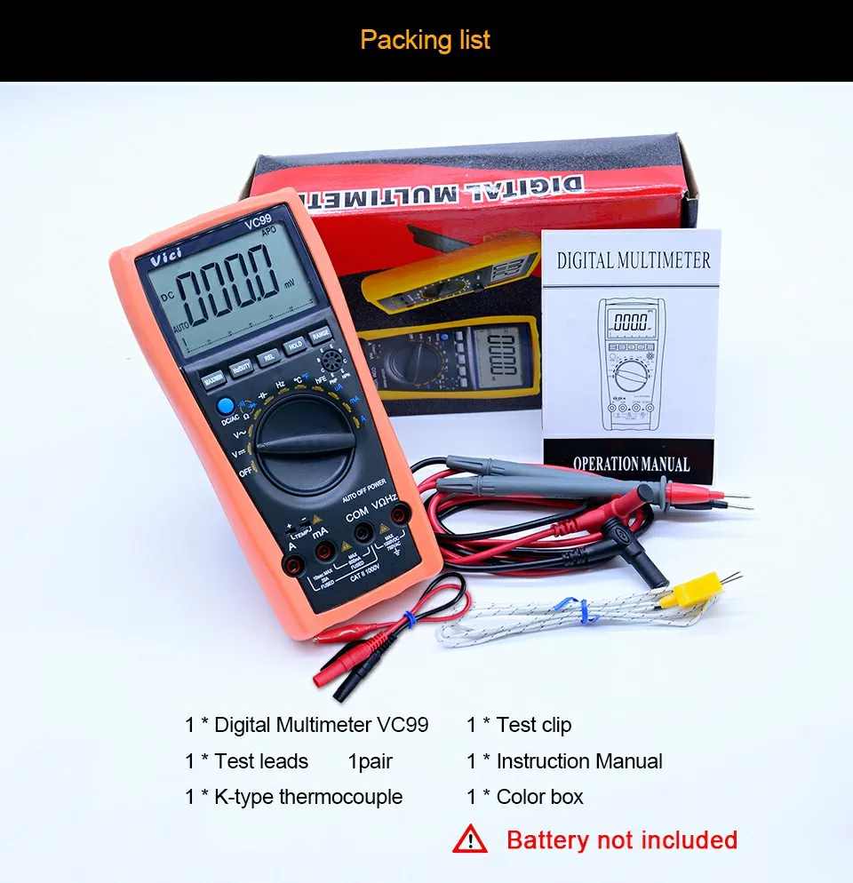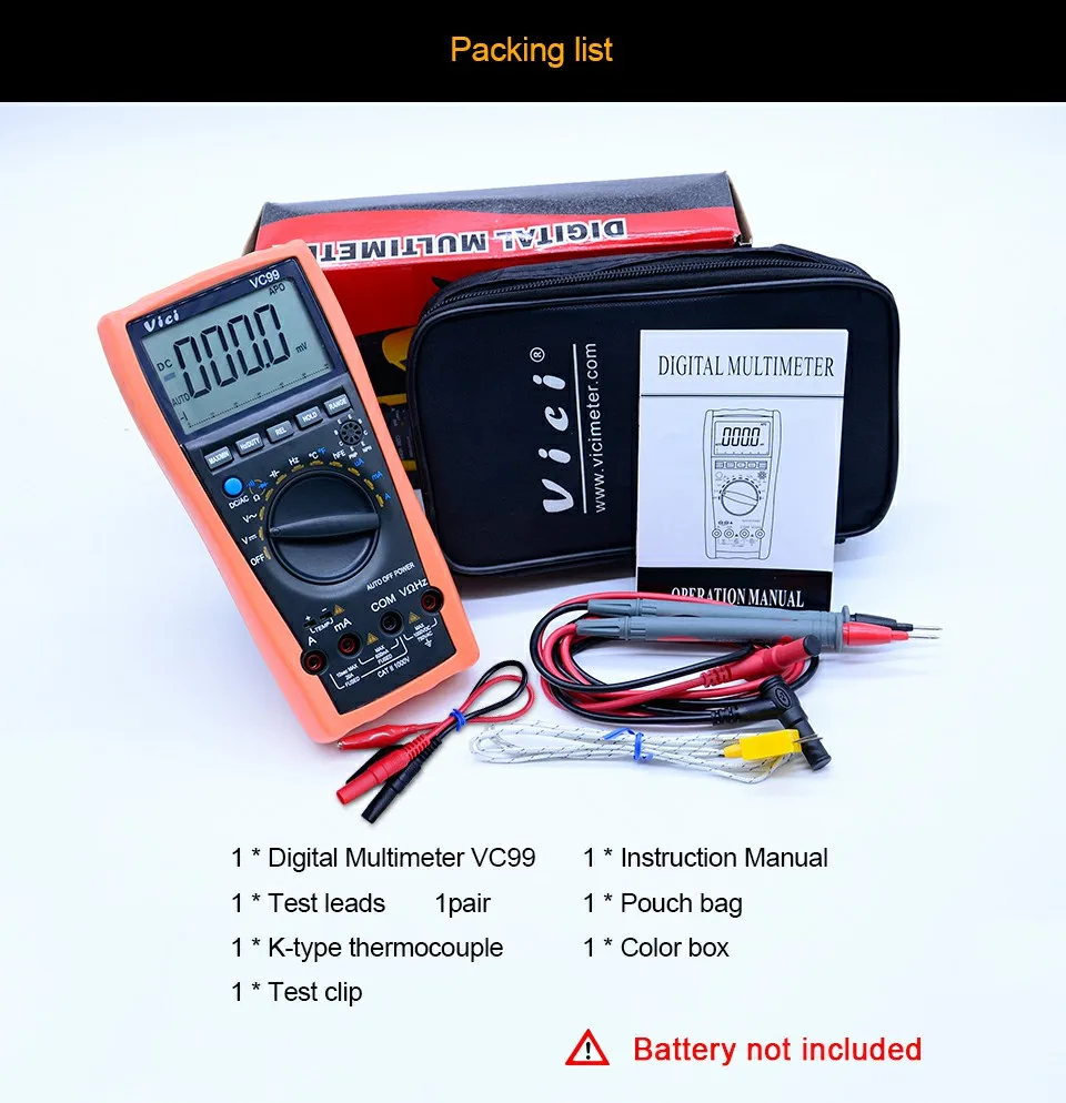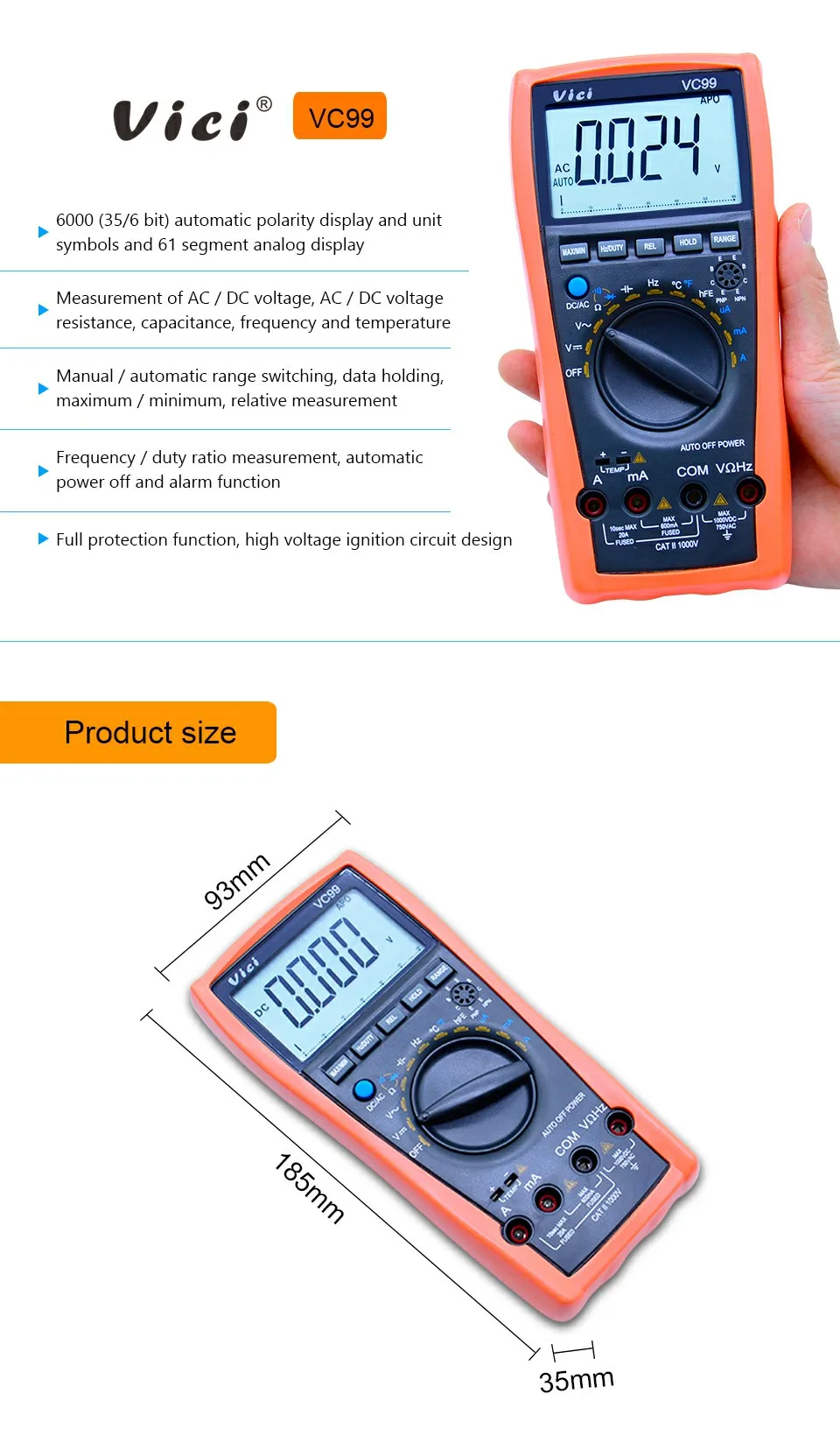 1. Дисплей: ЖК-дисплей;2. Максимальный дисплей: 6000 (3 6/7) цифр, автоматическая полярность, символ блока и аналоговый дисплей 61 секции;3. Метод измерения: двойное интегральное преобразование A/D;4. Частота дискретизации: около 3 раз/сек.5. Широкий диапазон: «OL» отображается в самой высокой цифре.6. Низкий дисплей батареи: “”7. Рабочая среда: (0 ~ 40)°, относительная влажность: <80%;8. Состояние магазина: (-10 ~ 40)°, относительная влажность: <80%9. Мощность питания: 2 шт. 1,5 V батарея («AAA» 7 # батареи); Цвет: черный10. Размеры: 185 × 93 × 35 мм (длина * ширина * высота);11. Вес: прибл. 290 г (включая аккумулятор);12. Аксессуары: Тестовые провода, руководство пользователя, датчик температуры, подарочная коробка.