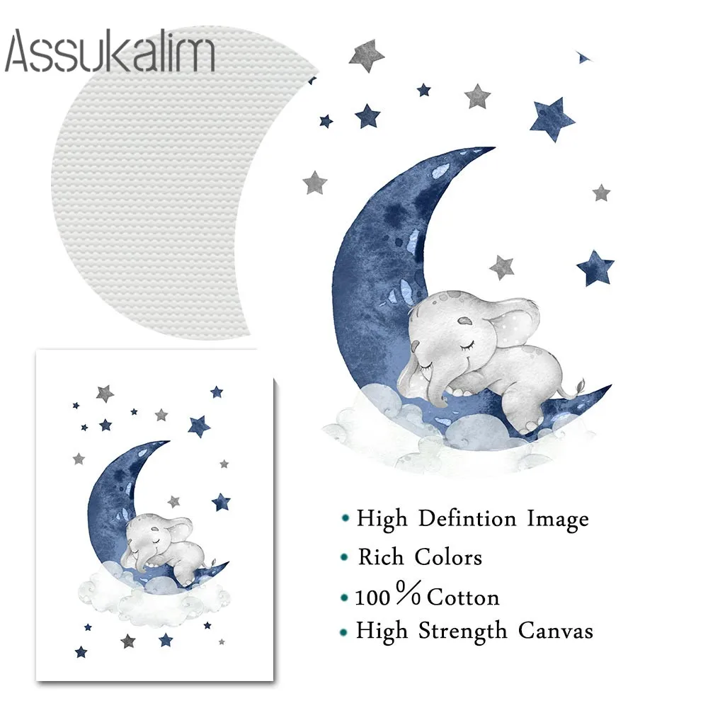 Мальчик пользовательское имя холст Плакаты Детская стены Картины плакат с дизайном слон с изображением луны и звезд, облака принты скандинавский принт Детская комната украшения