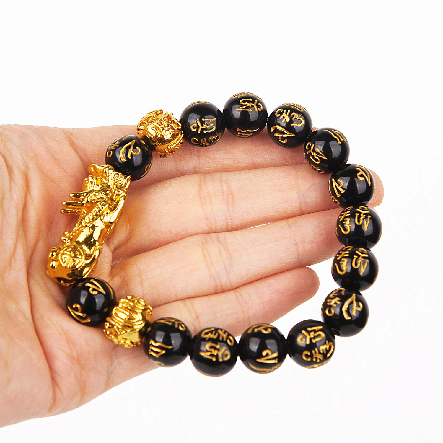 Браслет фэн-шуй, удачи, богатство, Будда, черный обсидиан, камень, бусины, мужской браслет, золотой браслет с подвесками, женский и мужской браслет унисекс