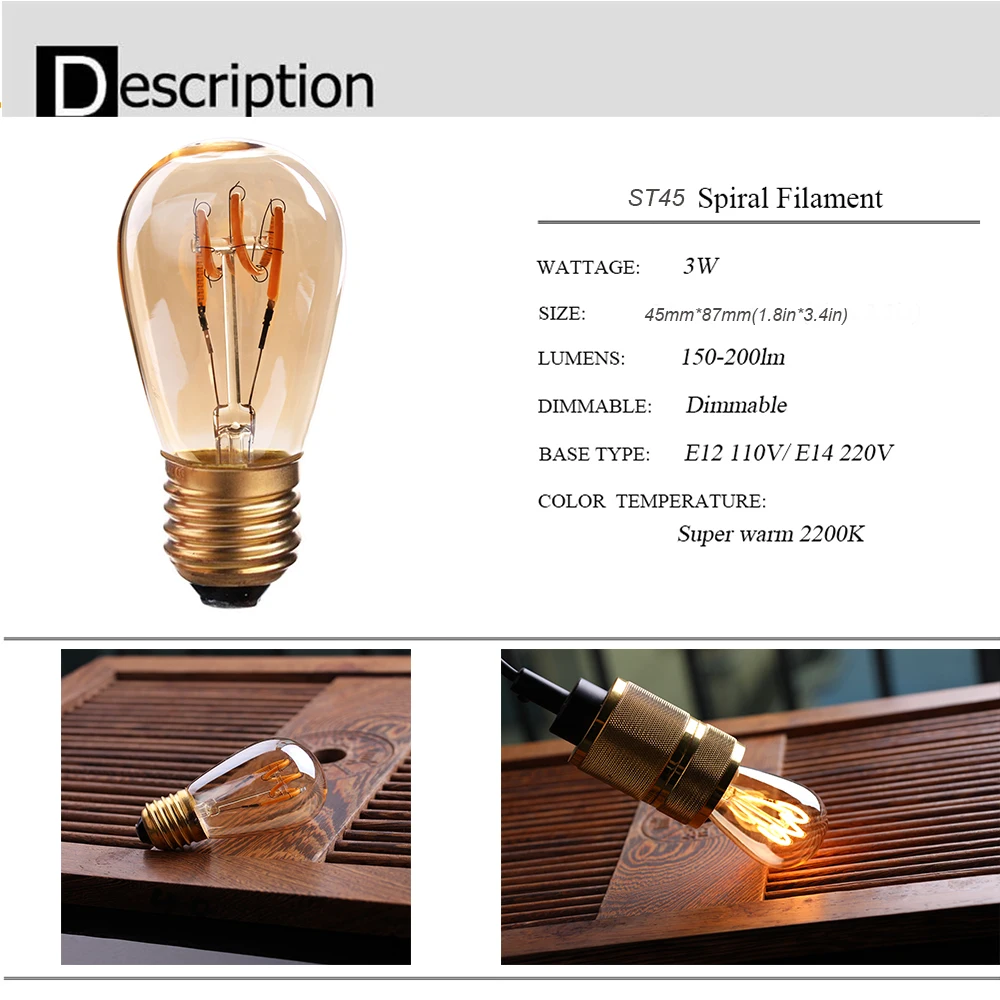 Светодиодный ламп накаливания G40 T45 ST64 G80 G95 G125 спираль светильник 3 Вт 2200K Ретро Винтаж лампы декоративный светильник ing с регулируемой яркостью Эдисон лампы