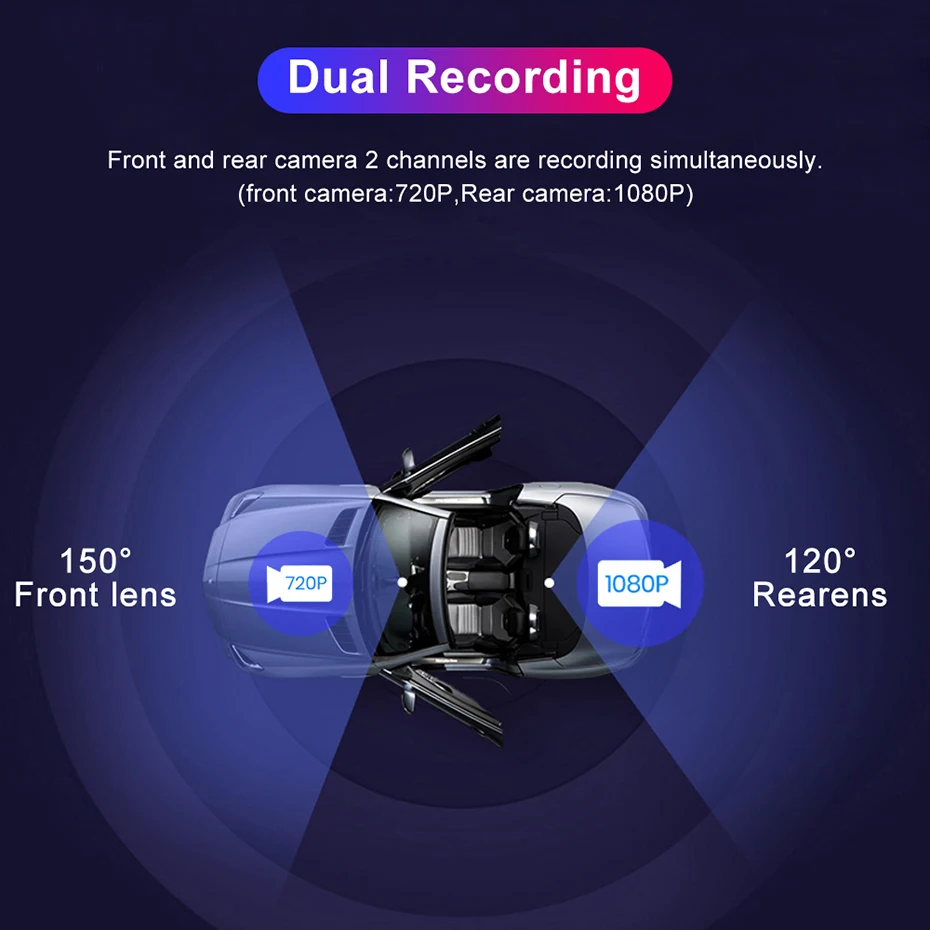 Этот автомобильный видеорегистратор имеет две камеры, которые позволяют одновременно записывать видео с двух разных углов. Спереди с 1280*720 P; Сзади с 1920*1080P.