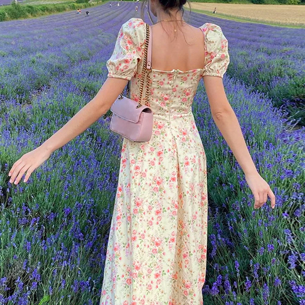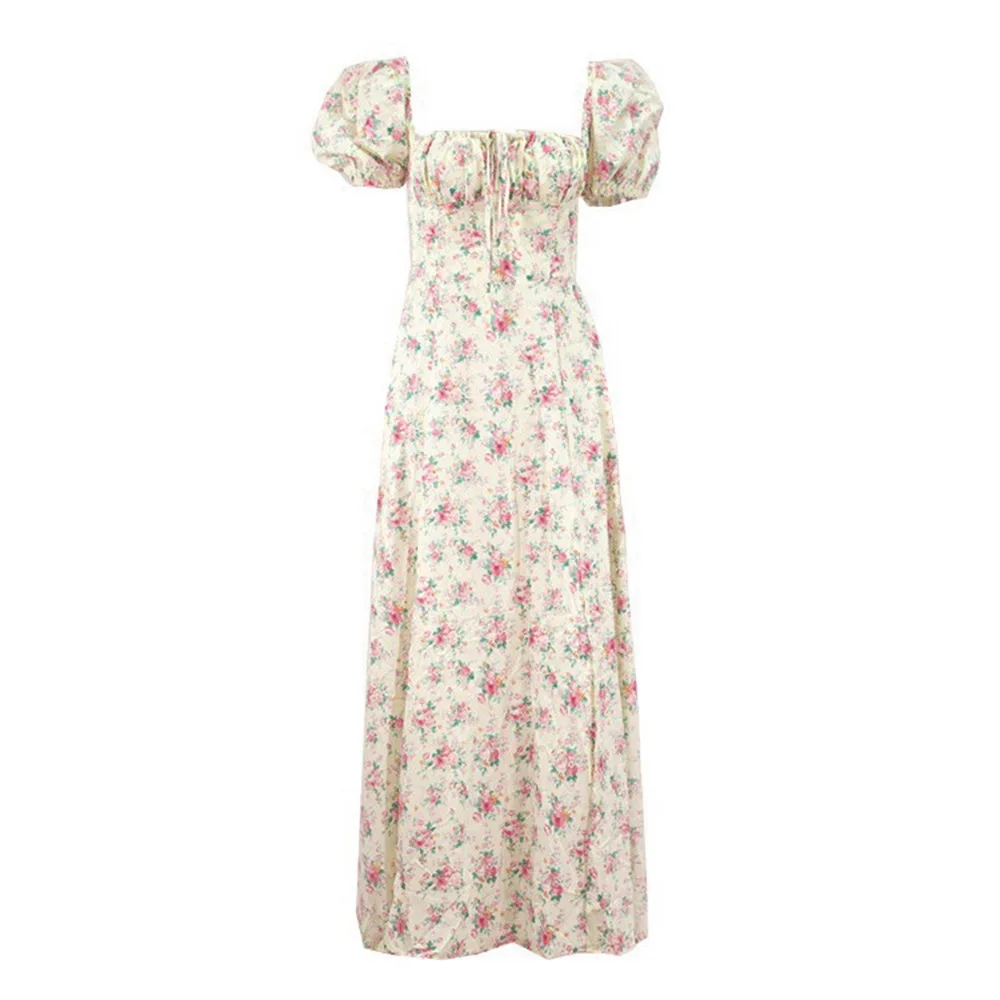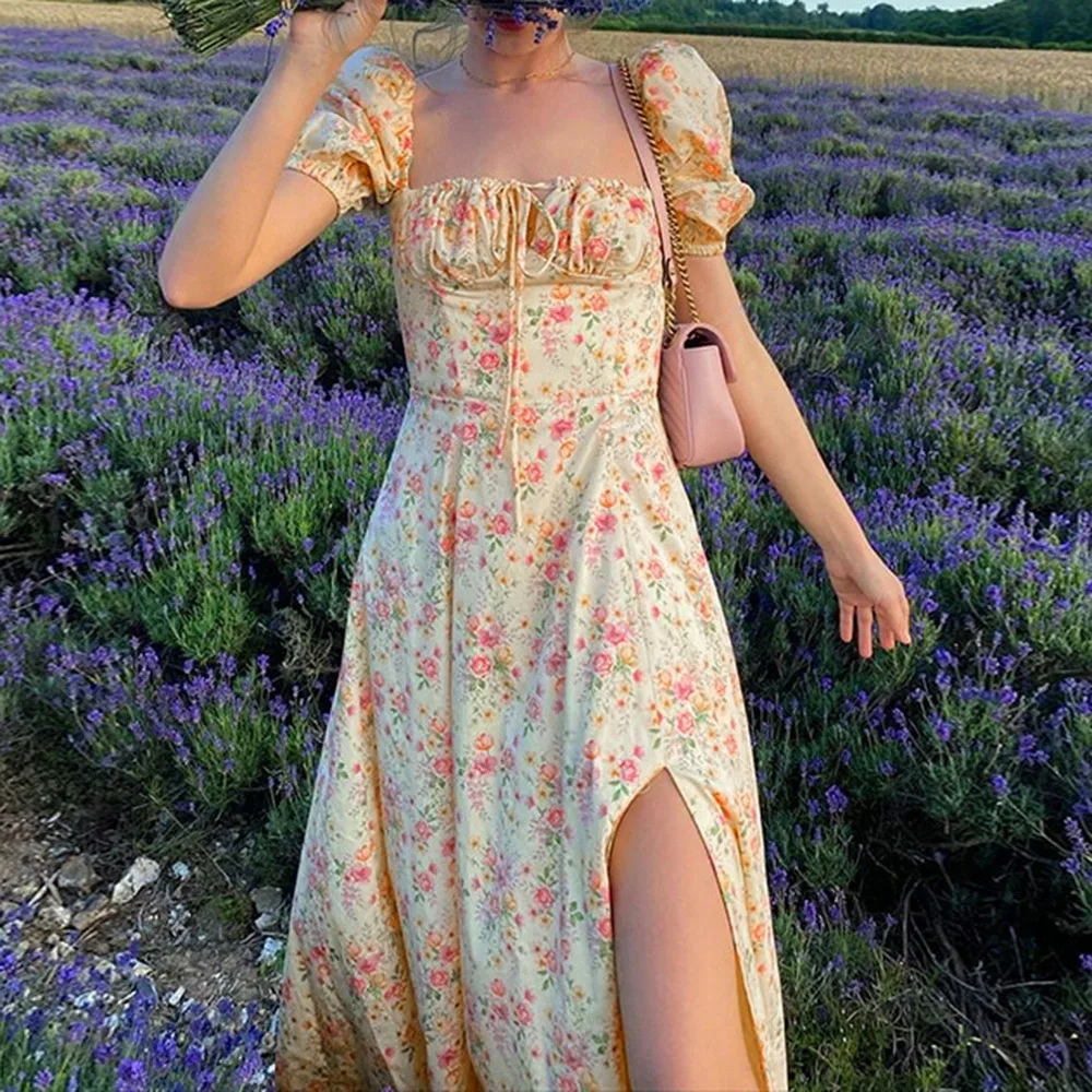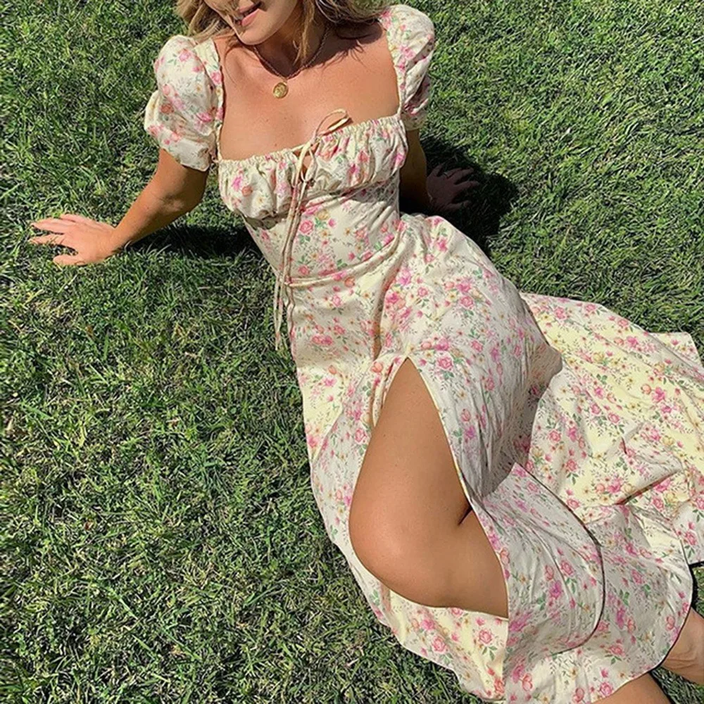 Платье женское с коротким рукавом-фонариком, длинный пикантный Сарафан Макси с оборками и завязками, с цветочным принтом, с высоким разрезом, для вечеринки, на лето