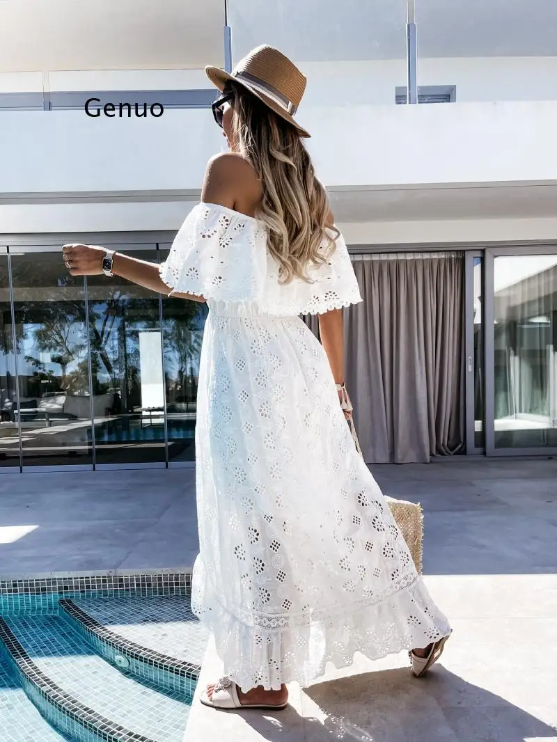 Платье женское кружевное в богемном стиле, белое пляжное пикантное модное с коротким рукавом, на одно плечо, на груди, лето 2021