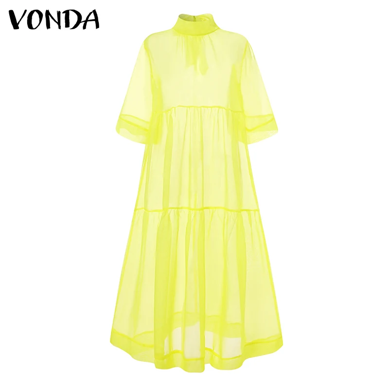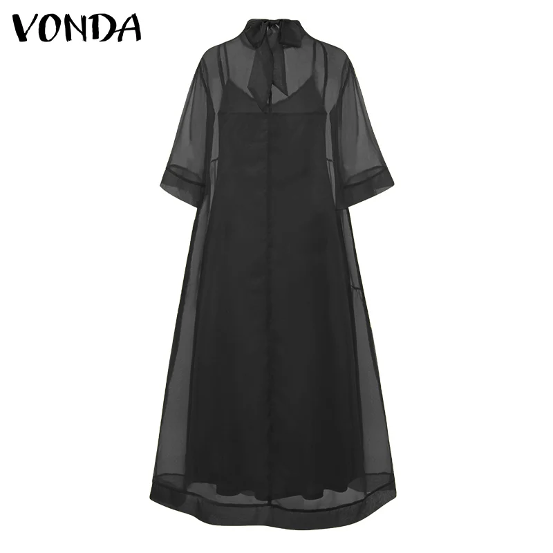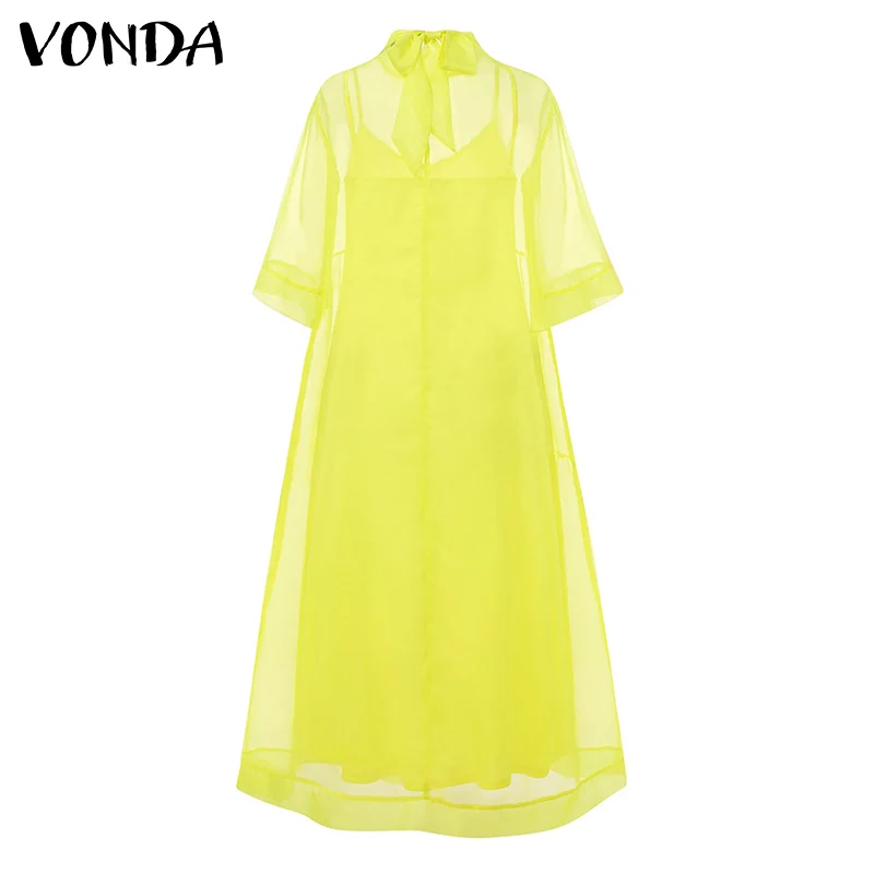 Женское богемное платье 2022 VONDA, сексуальное прозрачное вечерние жевное вечернее платье с коротким рукавом и высоким воротом и платье-комбинация, халат из двух частей