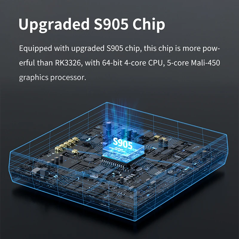 Мощный S905, с 64-битной 4-х ядерный Процессор, 5 Mali-450 графическим процессором. Этот чип мощнее чем RK3326, с 64bit 4-х ядерный Процессор, 5 Mali-450 графического процессора, а также поддерживает 4K @ 60fps видео жесткий декодирования и HDR обработки.