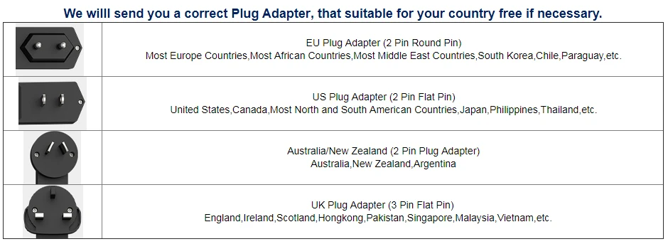 4 вида зарядных устройств могут быть выбраны (США/ЕС/Великобритания/Австралия), мы отправим зарядное устройство, подходящее для вашего региона, или вы можете сделать примечание при размещении заказа