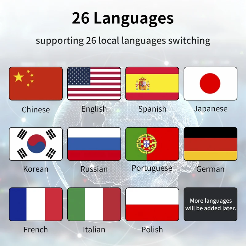 Многоязычная система, поддержка 26 языков, таких как английский, испанский, португальский, арабский, японский, корейский, французский, немецкий, иврит и т. Д. Больше нет проблем с языковым барьером.