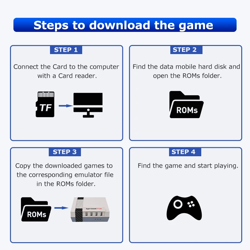 Шаг 1: подключите карту к компьютеру с помощью картридераШаг 2: Найдите дату мобильного жесткого диска и откройте папку ROMШаг 3: Скопируйте загруженные игры в соответствующий файл эмулятора в папке ROM.Шаг 4: Найдите игру и начните играть