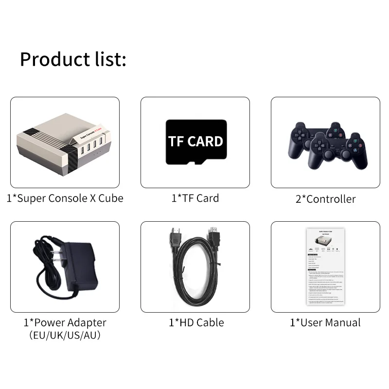 • Супер консоль X Cube * 1• Игровой контроллер * 2• Tf-карта * 1• Адаптер питания * 1• Упаковка * 1• Док-станция USB * 1
