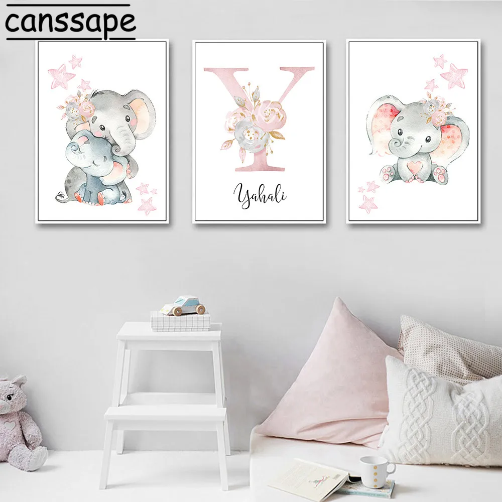 Детские настенные художественные принты с именем на заказ, постеры картина слона на холсте в скандинавском стиле, настенные картины, Розовый декор для спальни для маленьких девочек