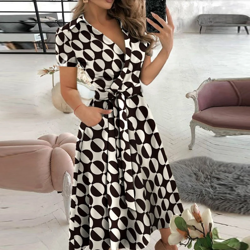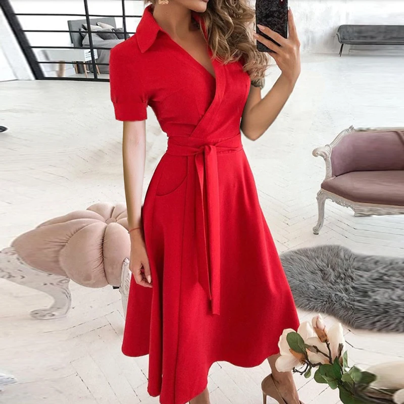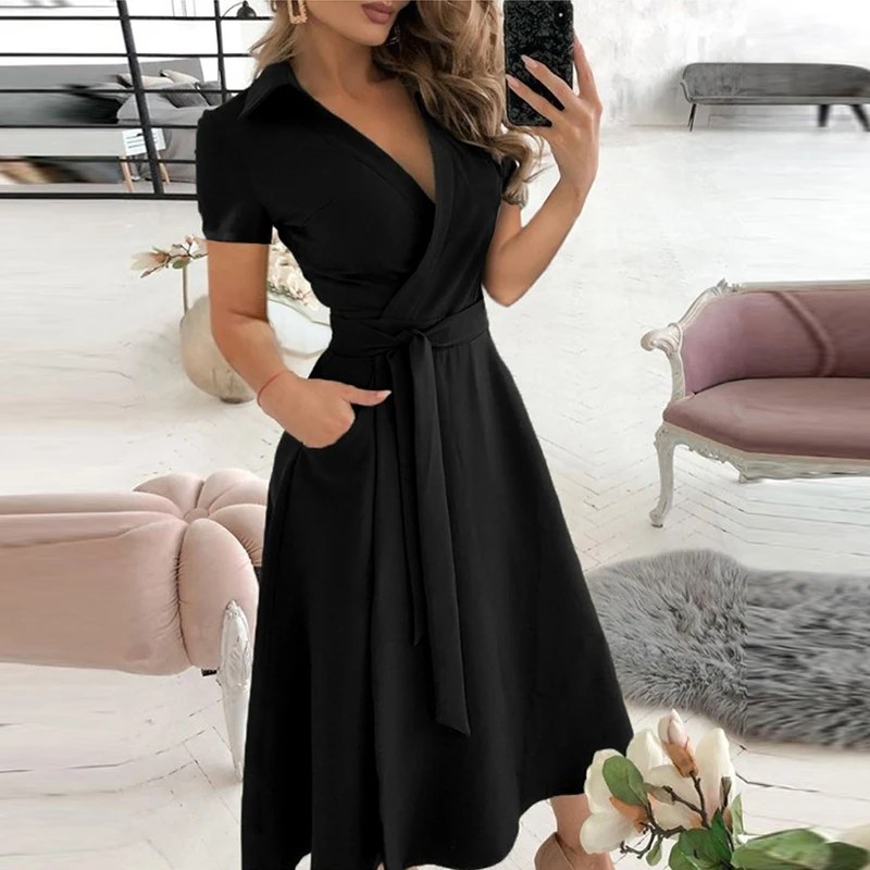 Женское длинное вечернее платье, однотонное летнее платье с V-образным вырезом и коротким рукавом, с поясом, элегантное