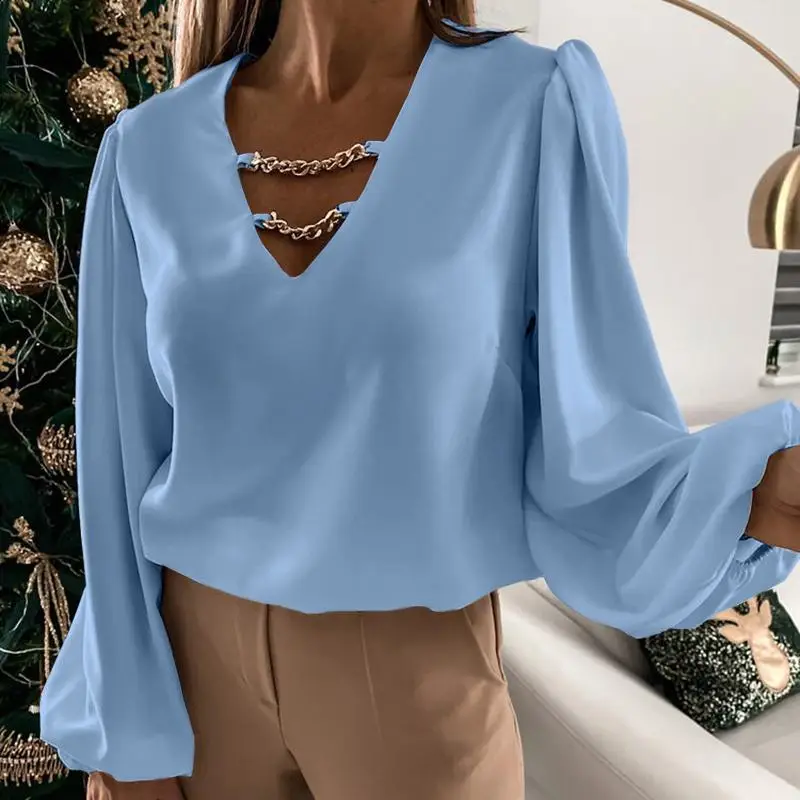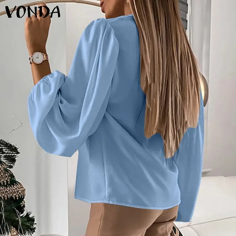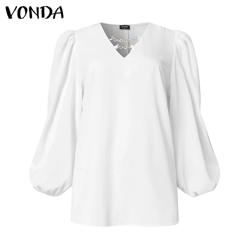 Женская элегантная офисная блузка VONDA 2022, модная пикантная блузка с длинным рукавом-фонариком и V-образным вырезом, повседневный однотонный топ на цепочке, блузы