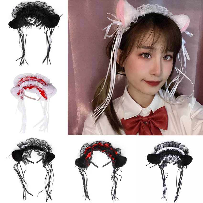 Повязка на голову женская плюшевая с бантом, кружевной ободок с кошачьими ушками, аксессуар для волос в стиле Лолиты