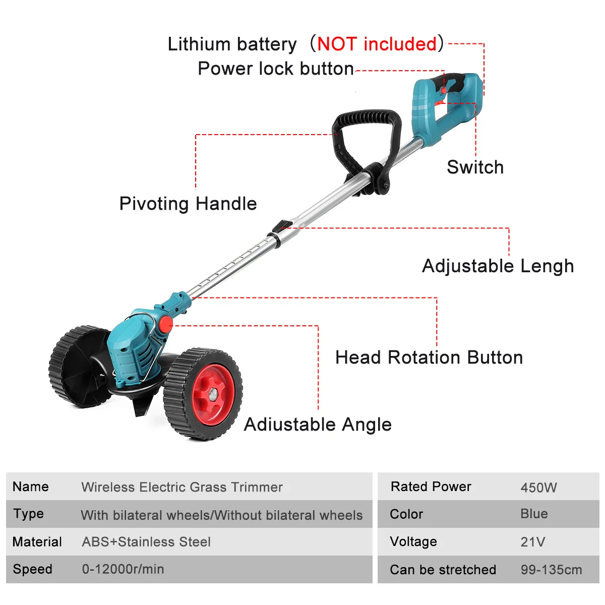 Название: беспроводной электрический триммер для травы Характеристики: Тип: с двусторонними колесами/без двусторонних колесМатериал: АБС-пластик + нержавеющая стальЦвет: синийНоминальная мощность: 450 ВтНапряжение: 21 вСкорость: 0-12000 об/минРастягивается: 99-135 см3 типа лезвийПластиковое лезвие: подходит для обрезки газонаМеталлическое лезвие: подходит для стрижки травыЛегированное полотно пилы: подходит для обрезки посевов, кустарников и т. д.