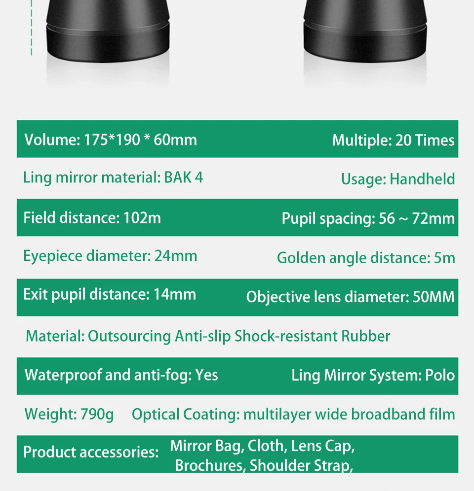 1,50 мм, супер большой объектив, стабильный просмотр (не легко встряхнуть)2,24 мм окуляра (в условиях низкого светильник, он может принести более четкие изображения.)4. Который может быть использован в концерте любимых звезд или игре5. Вы также можете четко смотреть птиц6.HD предотвращает головокружение из-за стекла BAK 4