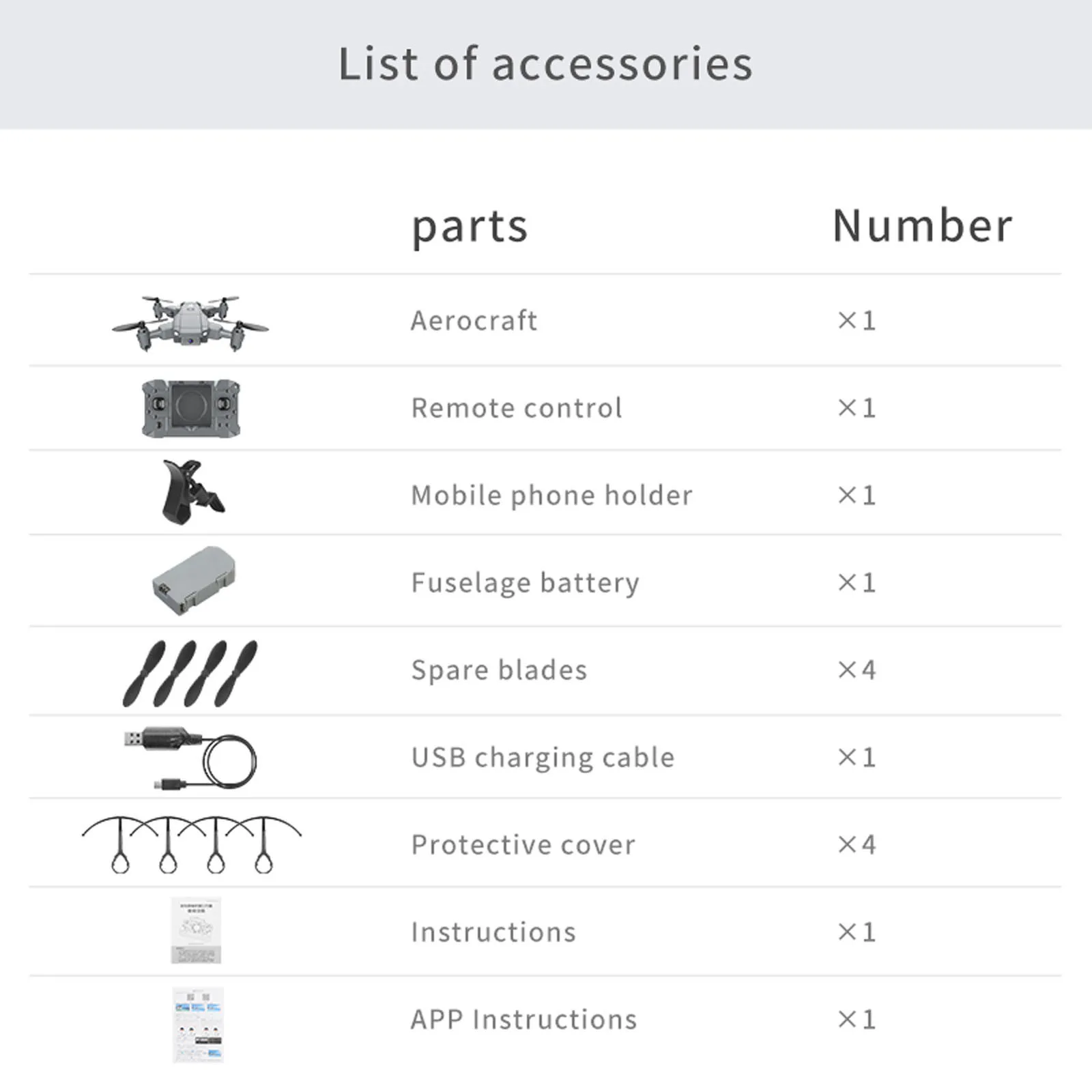 1XAircraft 1 пульт дистанционного управления 1X мобильный телефон Держатель 1 аккумулятор Xbody, 4XЗапасные части Вентилятор 4x защитная рамка 1XUSB кабель для зарядки Примечания: 1. Рекомендуется Для использования в возрасте 6 +, до 6 лет, пожалуйста, используйте под наблюдением взрослых. 2. Этот продукт имеет Много параметров. Пожалуйста, внимательно выбирайте стиль, который вам нужен.