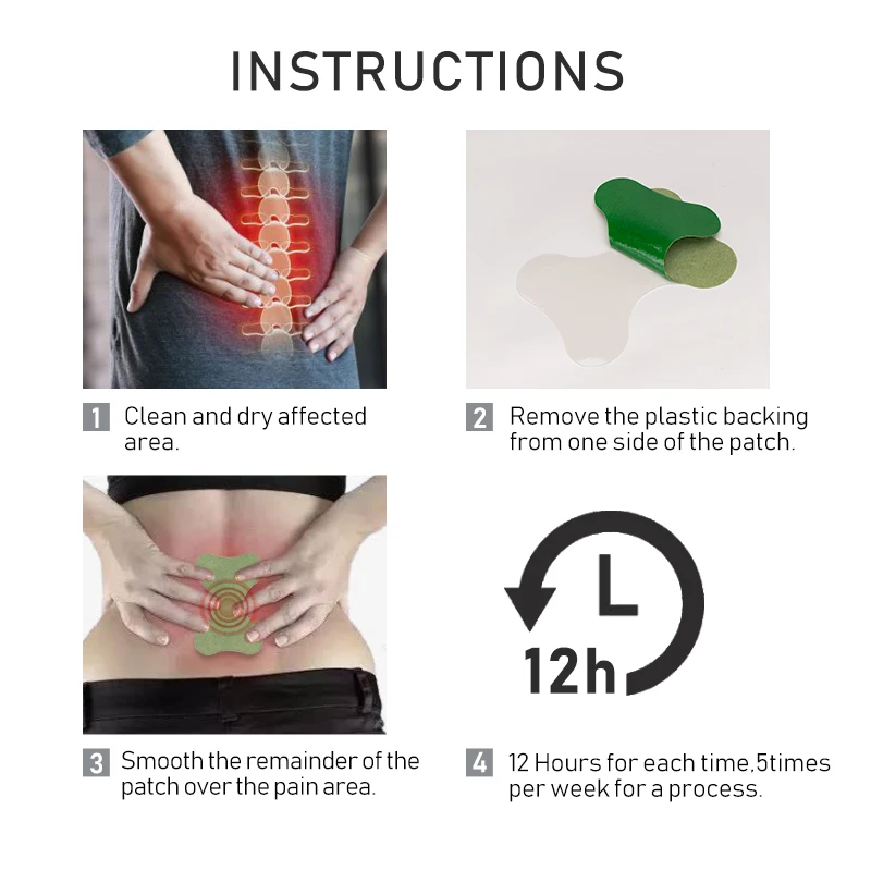 Как использовать:-Чистая и сухая область.-Снимите пластиковую подложку с одной стороны пластыри.-Гладьте ту сторону над областью, где вы хотите облегчить боль.