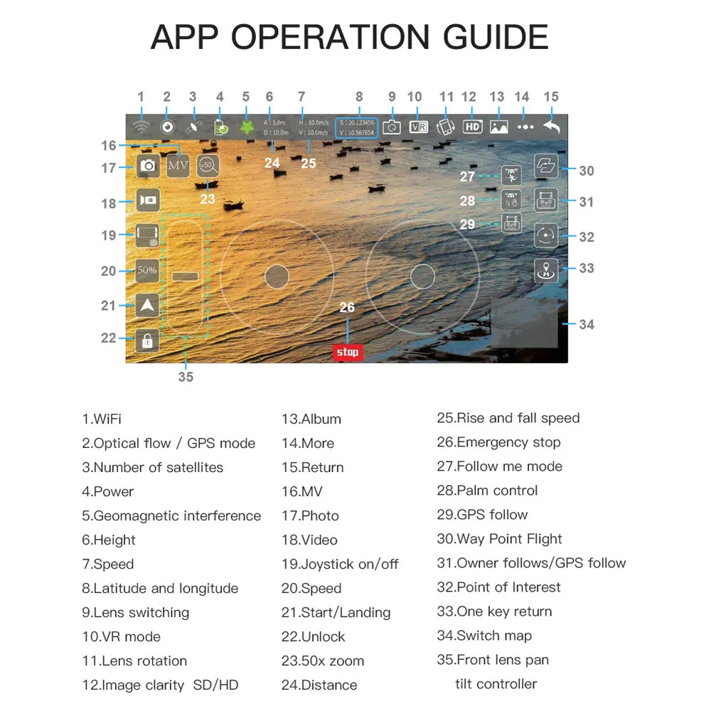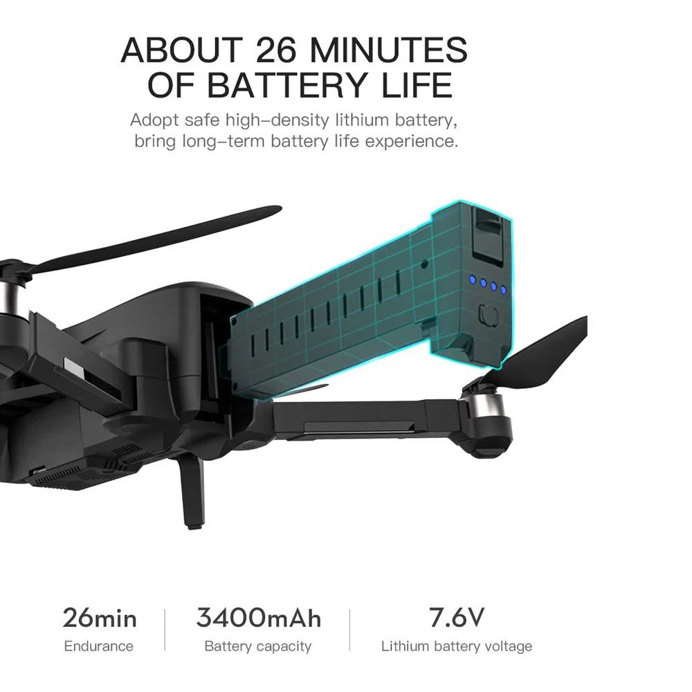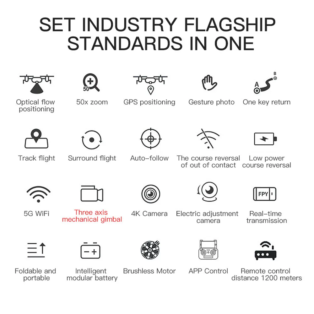Название товара: SG906 PRO Бесщеточный Дрон 2 Beast 2 RC Датчик давления: Установка высоты Три оси Механическая самостабилизирующая головка: Поддержка Самостабилизирующийся Электронный объектив стабилизации изображения: Поддержка Емкость smart Литиевая батарея: 7,4 В 3400 мАч Пульт дистанционного управления: 4x15V "AA" батарея (не входит в комплект) Мотор: 1806 бесщеточный Двигатель Время полета: около 26 Мин Время зарядки: около 6 часов Usb-зарядка: 5 В Расстояние управления: 1200 м (свободное взаимодействие и отсутствие окклюзии) 5G изображение Wifi Расстояние передачи: 800 м (свободное взаимодействие и отсутствие окклюзии) GPS следуй за мной: о 30 м Изображение Следуйте за мной: Около 5 м Жесты руки Съемка: 1-3 м Фокусное расстояние "50 Время Цвет: черный Размер изделия "19X7.5X9.5cm (в сложенном виде) 45X42X7.5cm" (в разложенном виде) Вес полета: 552 г Аэрофотосъемка Параметры конфигурации: 4K Разрешение записи видео (фронтальная камера) : 2048*1080 (TF) Режим SD: 1208*720; (приложение) режим HD: 2048*1080 (приложение)" Фото Разрешение (фронтальная камера):"4096*3072P(TF)/4096*3072P (приложение)" Видео Разрешение (камера пониженного обзора) 1280*720p Фото Разрешение (камера пониженного обзора) 1280*720p Рамка Частота кадров (фронтальная камера) 25 кадров в секунду Рамка Частота кадров 25 кадров в секундуОсобенности: