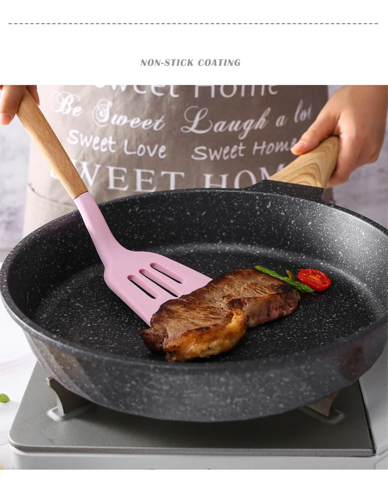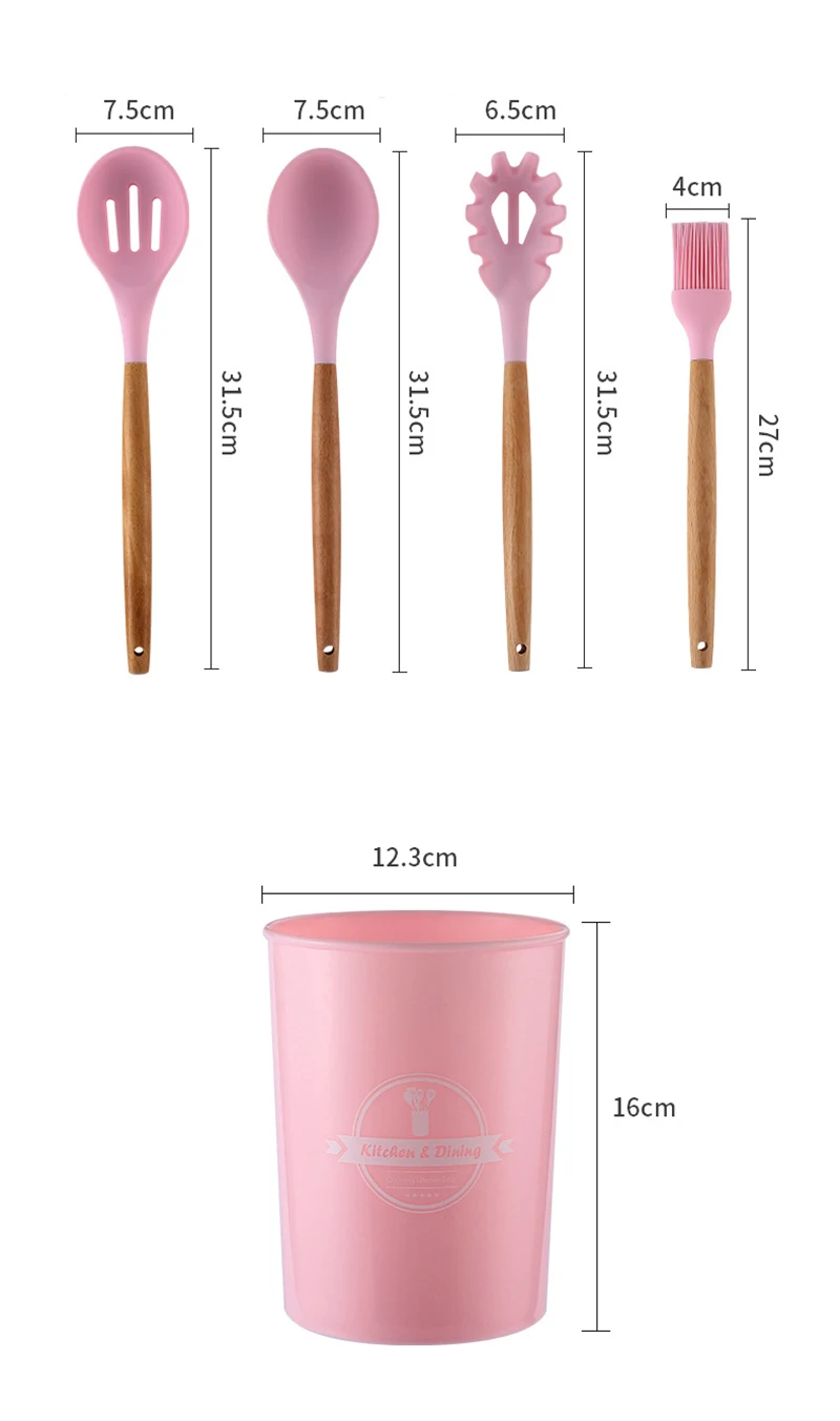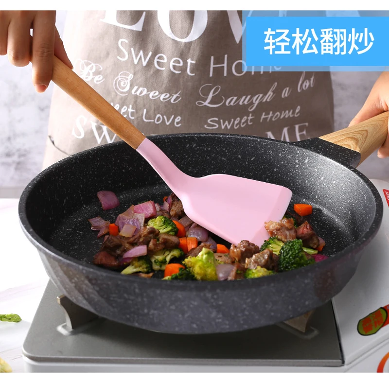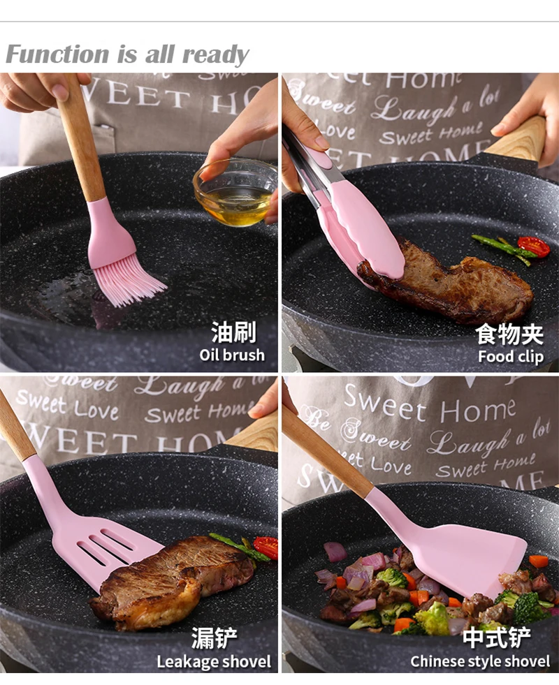 Защита окружающей среды, нетоксичный, термостойкий, антипригарный, прочный, безопасный, легко чистится для кухонной посуды. Подходит: микроволновая печь, тостер, пароварка, можно варить и стерилизовать. Материал: Силикон из натурального дерева акации