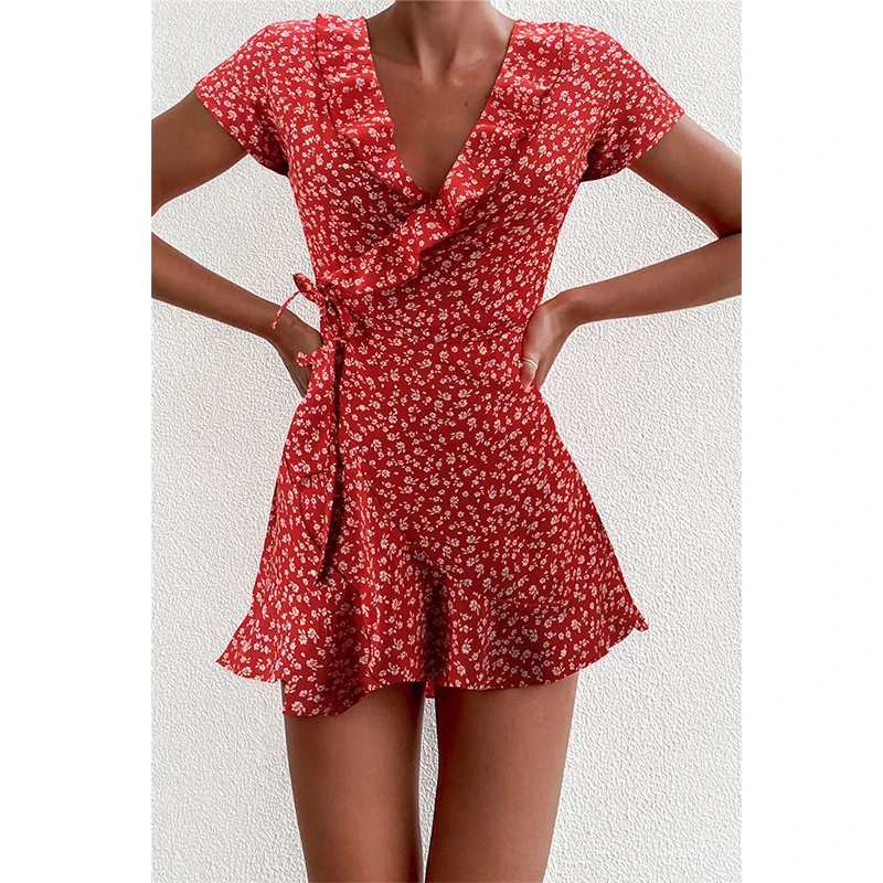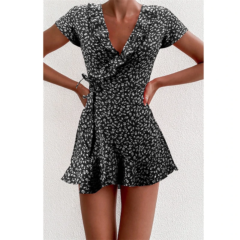 Летнее женское Короткое платье-трапеция, с цветочными оборками и V-...