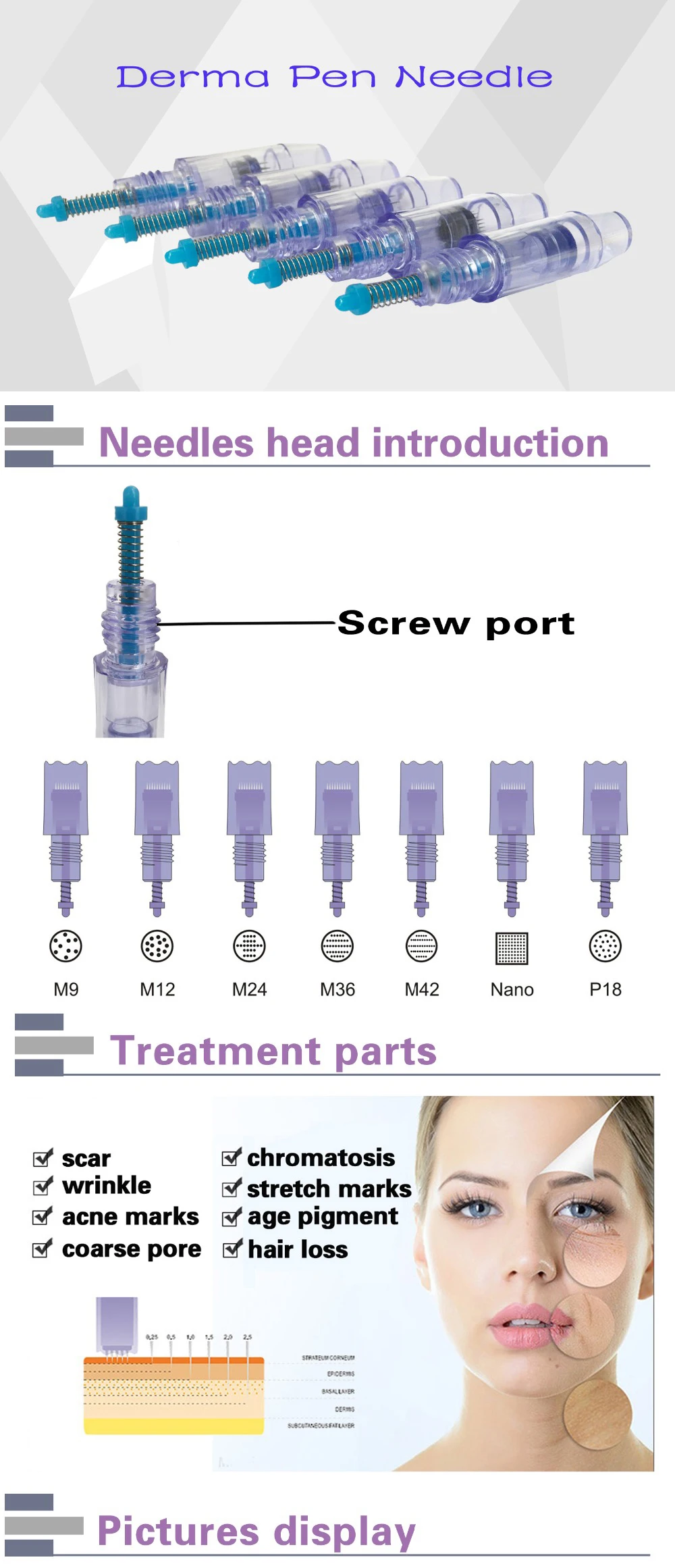 О картридж иглы:Картридж для иглы Derma pen использует стержень для разминания с количеством игл, сочетая с функциональной жидкостью для питания, регулярно катится в местах, которые необходимы для лечения. Его можно прокалывать Более 300000 микро сосуды на эпидермис в течение пяти минут, заключается в создании эффективного доставки питательных веществ системы между эпидермис и подкожные ткани. Затем Питательная жидкость может эффективно проникать в кожу. Таким образом, эффект ухода за кожей становится более совершенным. Микроигольчатая терапия является эффективной, безопасной и надежной. Удобно управлять микро-иглой. Вы можете использовать его для активного отдыха, включая подстилку, но, пожалуйста, обратите внимание, что необходимы принадлежности для защиты от солнечных ожогов.Функции различных игл:Для: МТС, микроигольчатая терапевтическая система(1)9 контактных игл: ремонт моль ямы, удаление акне, Устранение растяжек, морщин и т. Д.(2)12 контактных игл: ремонт акне pox ямы, удаление акне, Устранение растяжек, морщин и т. Д.(3)36/42 контактная Игла: отбеливание, полив, удаление пятен, омоложение кожи, сужение пор и т. д.(4) Нано-игла (квадратная и круглая, 3D/5D игла): безболезненный импорт питания, отбеливание, увлажнение, удаление пятен, омоложение кожи, сужение пор и т. Д.