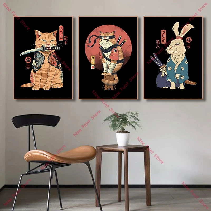 Японский плакат с татуировкой самурая кошка ретро искусство Гостина...