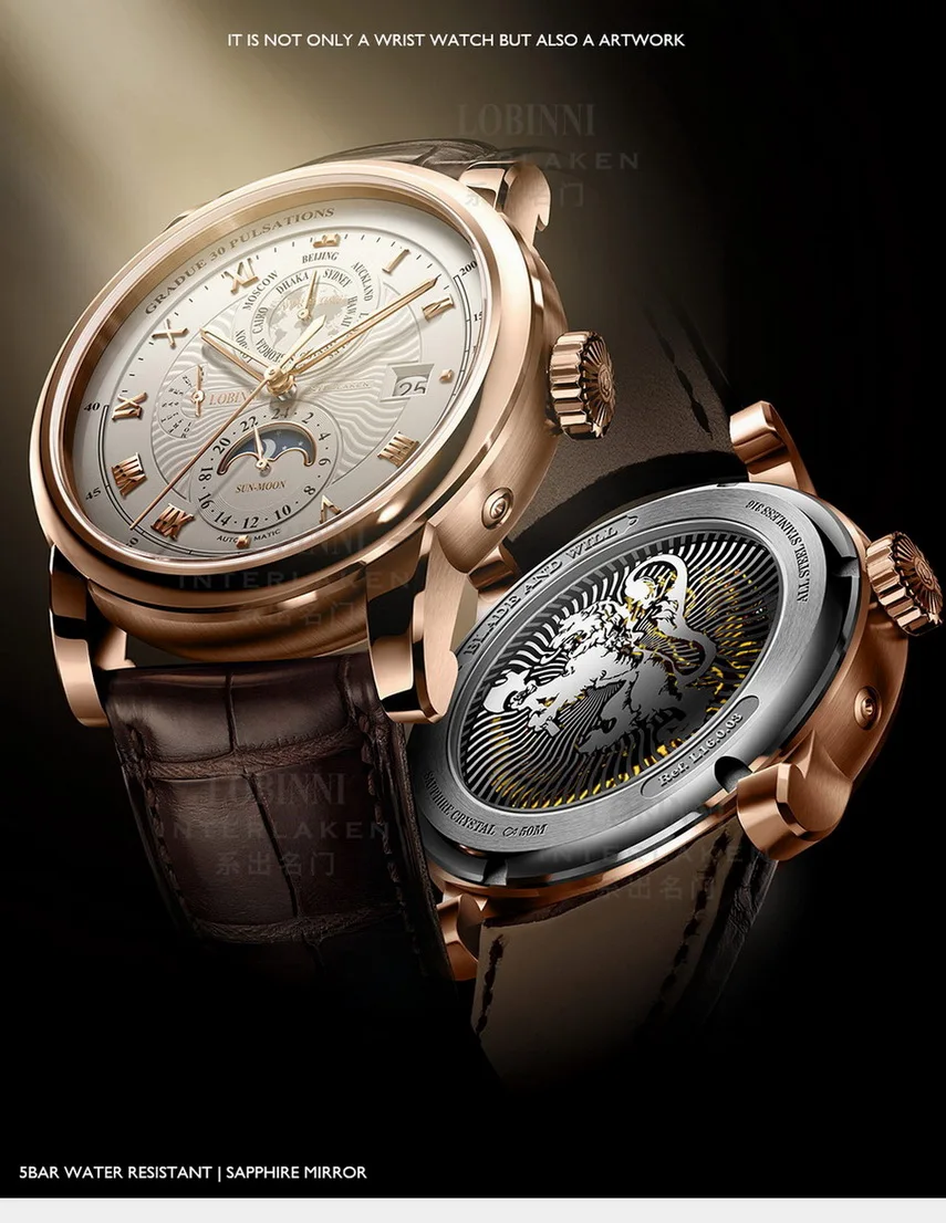 Мужские автоматические часы LOBINNI, роскошные механические водонепроницаемые швейцарские часы с сапфировым стеклом, мировое время