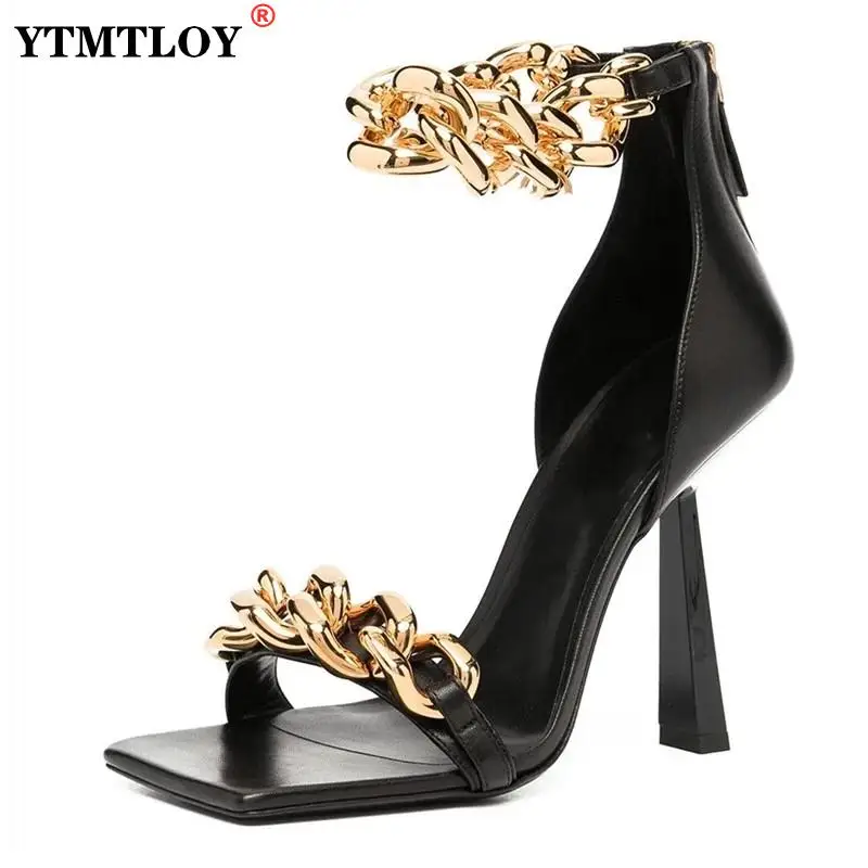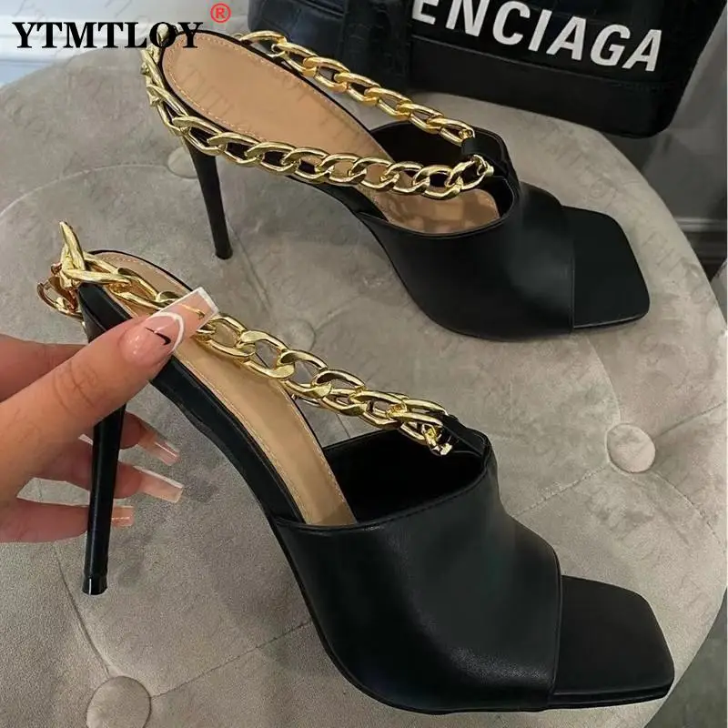 Женские босоножки с квадратным носком, на высоком каблуке, с золотистой цепочкой