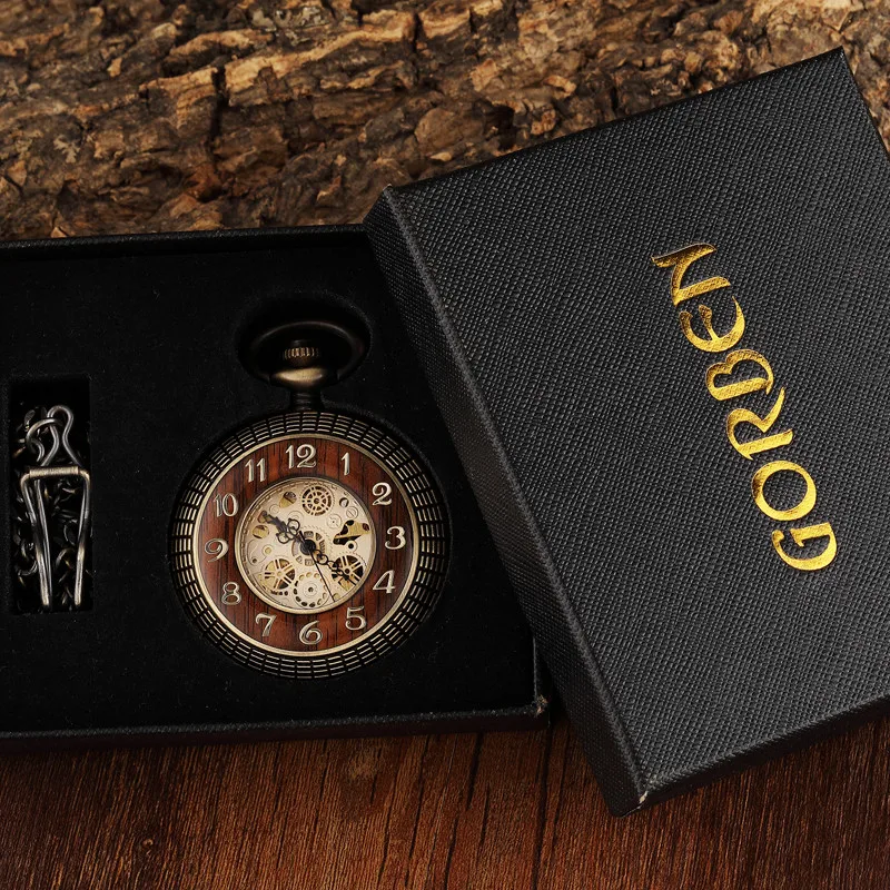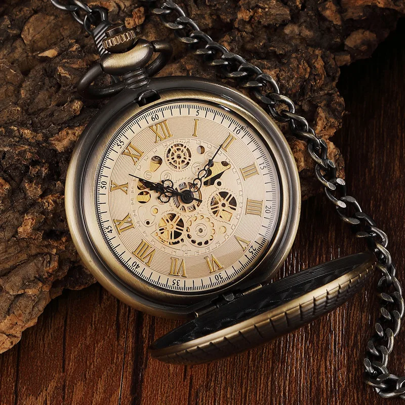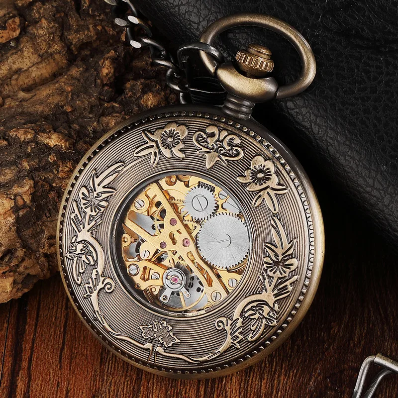 Винтажные мужские механические карманные часы с деревянным циферблатом и резным циферблатом с цифрами, уникальные механические часы в стиле стимпанк с отверстиями, бронзовые часы с цепочкой
