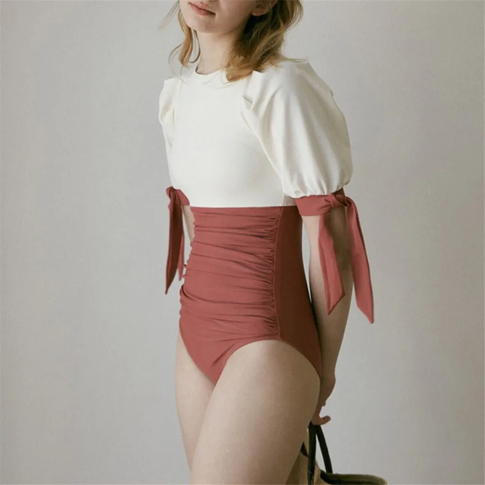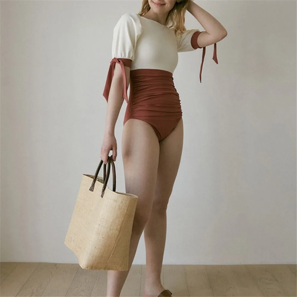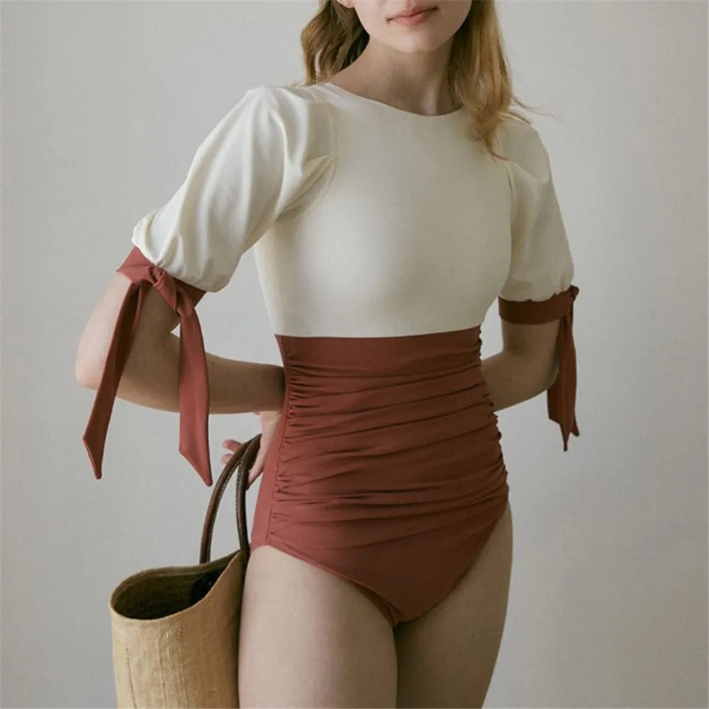 Женский слитный купальник с коротким рукавом, контрастный цвет, купальник с регулировкой живота, винтажный купальник на шнуровке, монокини с ремешками по бокам