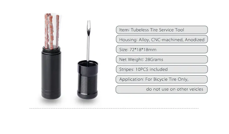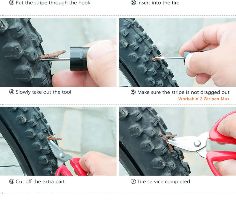 Этот инструмент предназначен только для бескамерных велосипедов. Для ремонта проколов он может вставлять 2 полоски за раз. Пожалуйста, замените другой метод, если 2 полосы не достаточно велики, чтобы подключить отверстие.