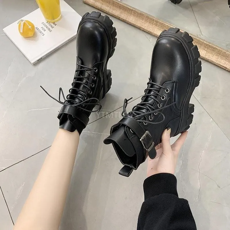 Женские зимние короткие мотоциклетные ботинки с пряжкой и круглым н...