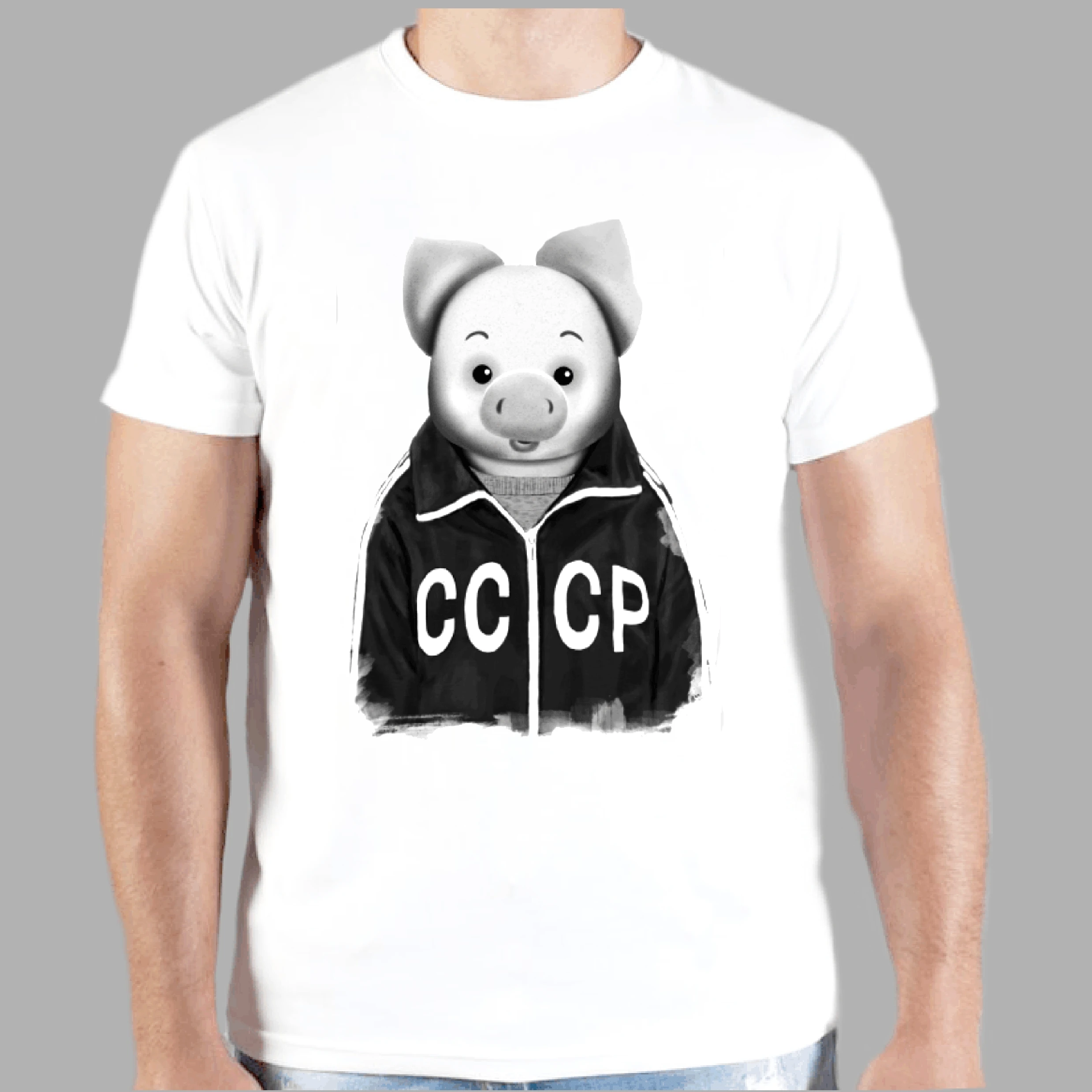 (Т-027) "СССР Хрюша" Футболка белая хлопок с добавлением полиэстера детские и взрослые размеры от 22 до 70 Большие