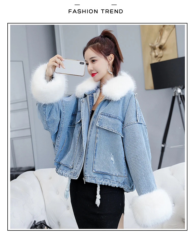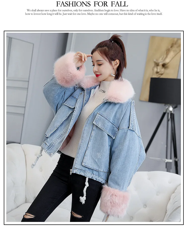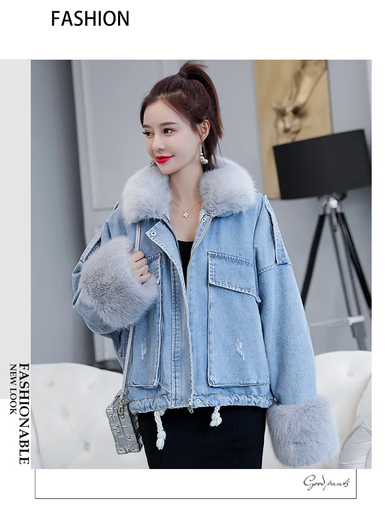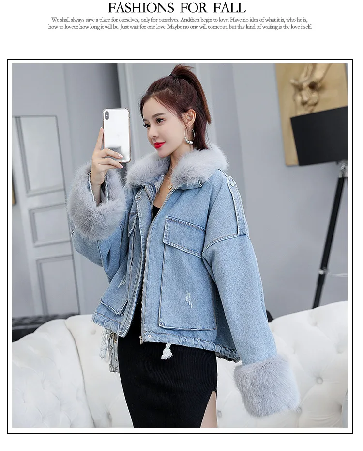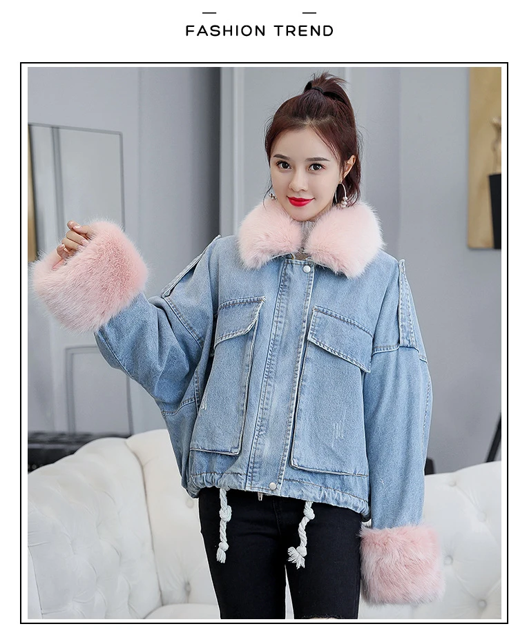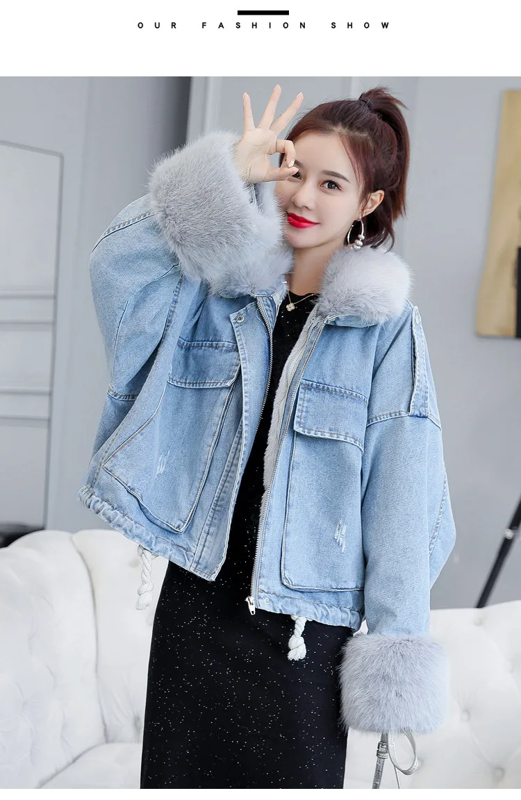 Женская джинсовая куртка с меховым воротником, винтажная Толстая те...