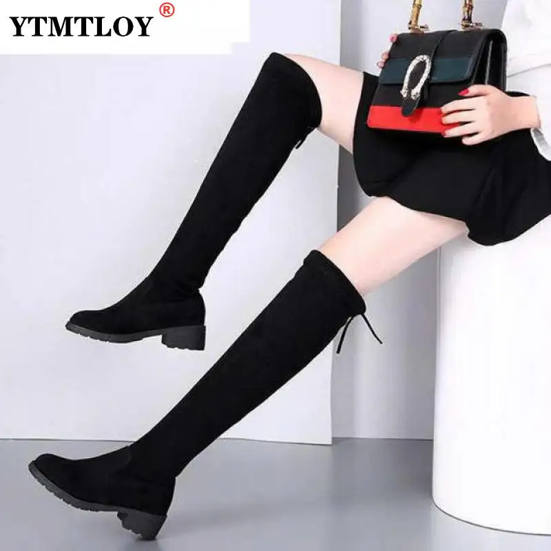 Размеры 3441 Зимние ботфорты выше колена женские ботинки из эластичного трикотажного полотна для женщин с завышенной талией, сексуальные кружева на плоской подошве, женские туфли на плоской подошве, Bota Feminina 660