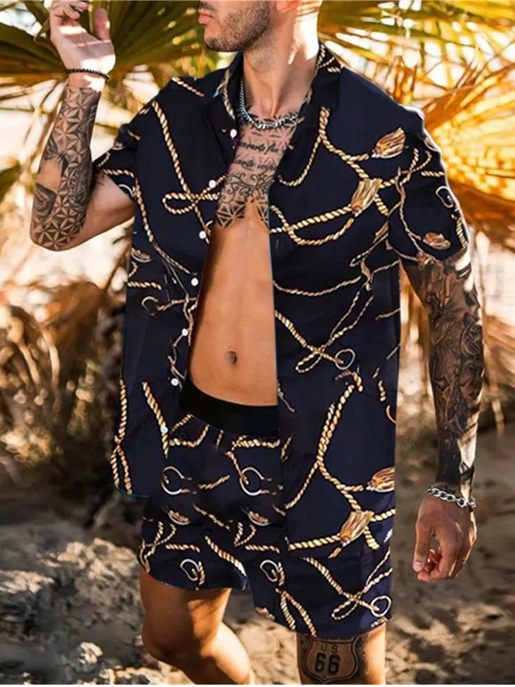 Мужская рубашка с коротким рукавом и принтом, пляжные шорты с лацка...