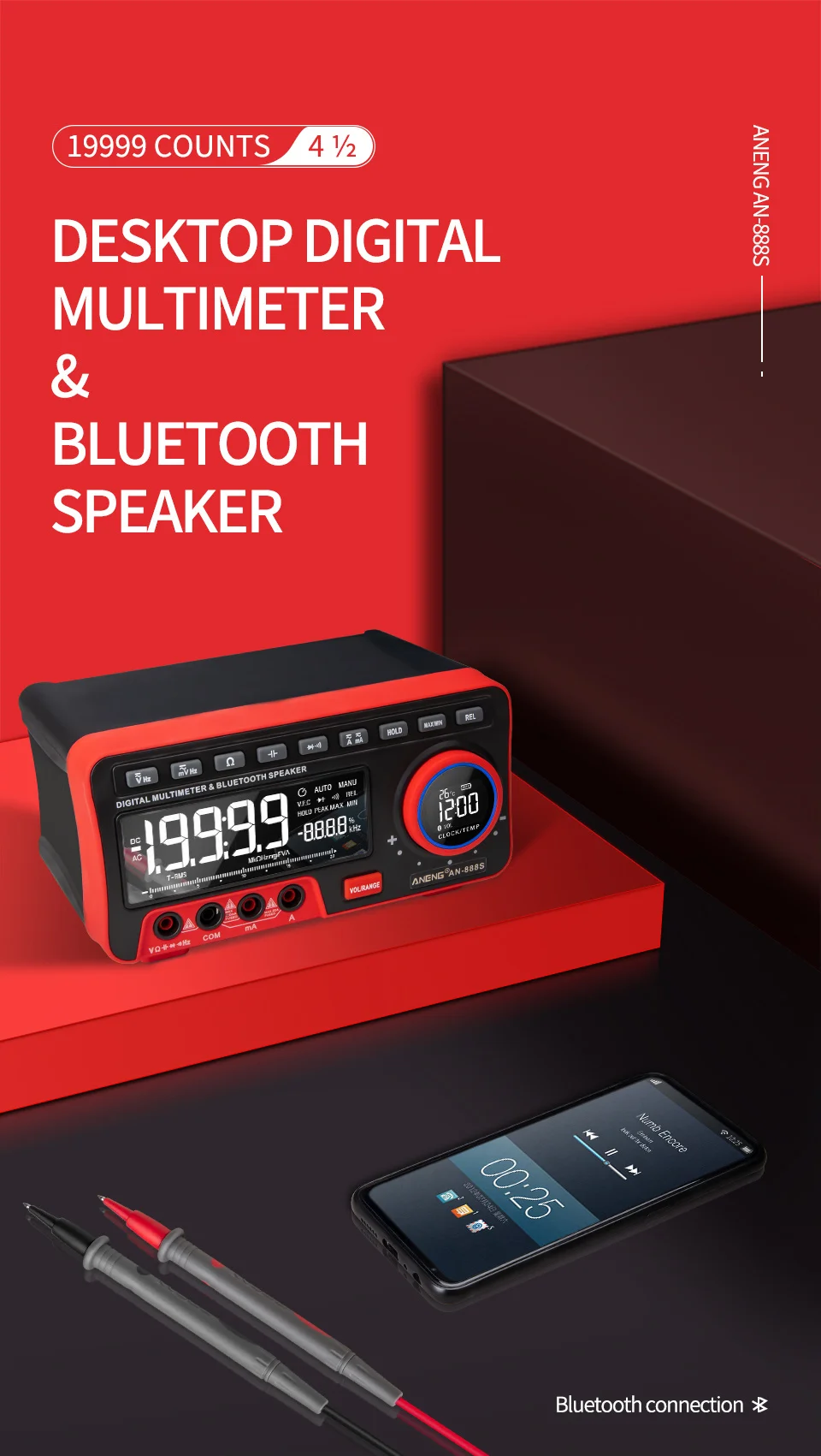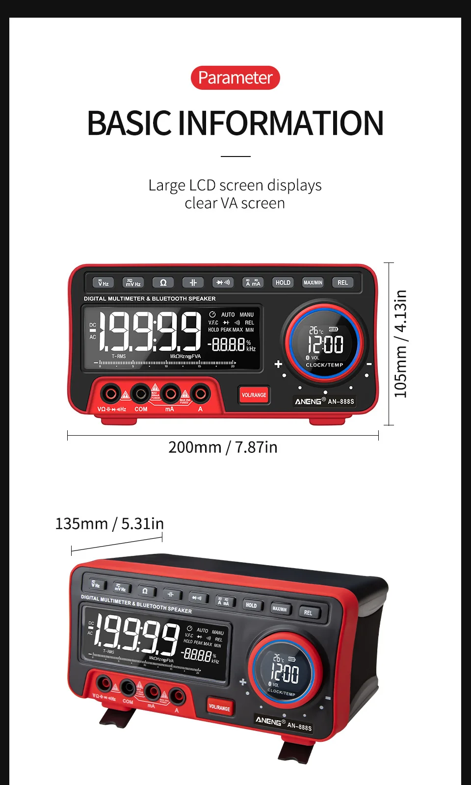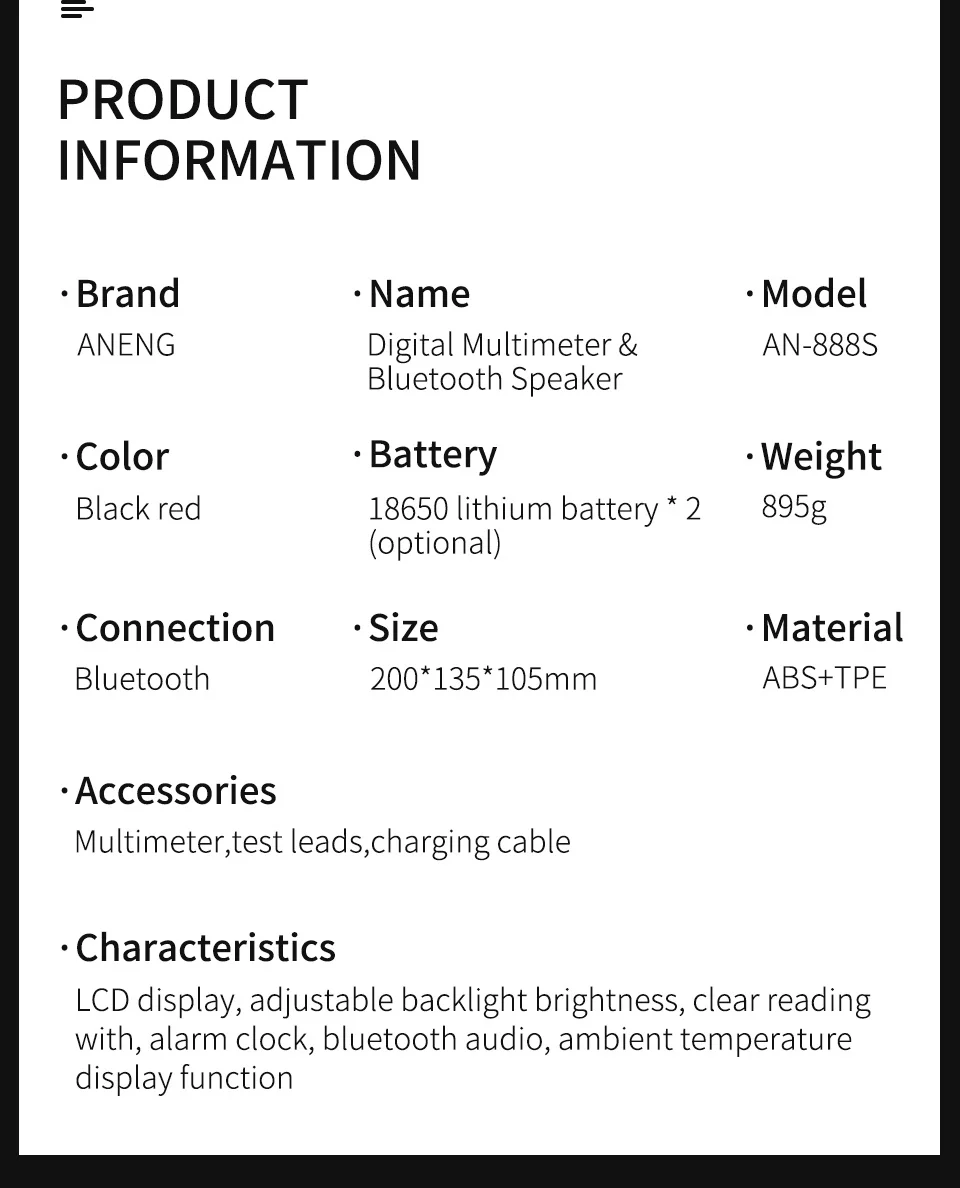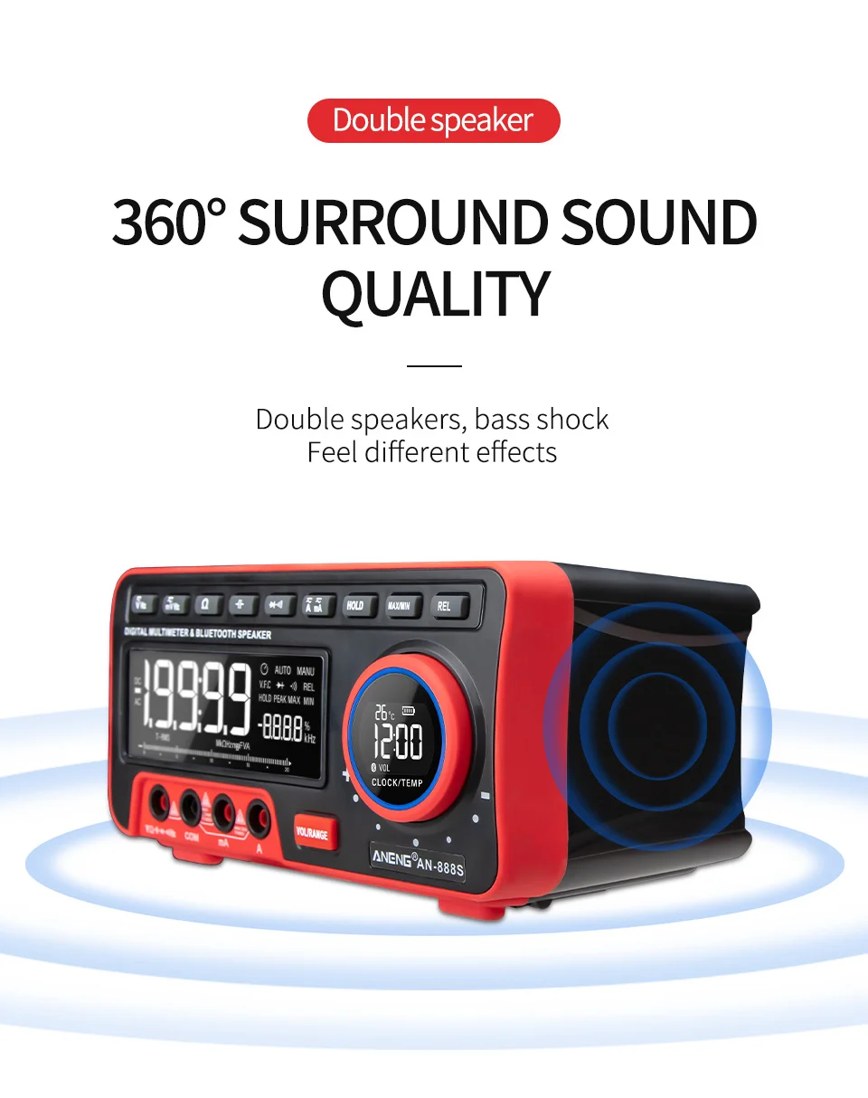 Этот продукт представляет собой автоматический многофункциональный цифровой мультиметр с 19999 высокоточным дисплеем.Счетчик управляется литиевой батареей, с реальным измерением rms, ЖК-дисплеем, регулируемой яркостью подсветки, четким считыванием, часами, будильником, аудио Bluetooth, дисплеем температуры окружающей среды.