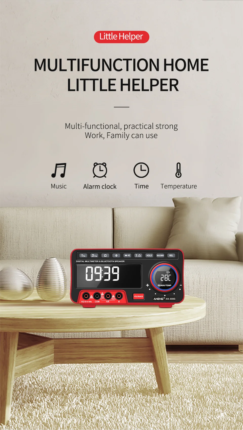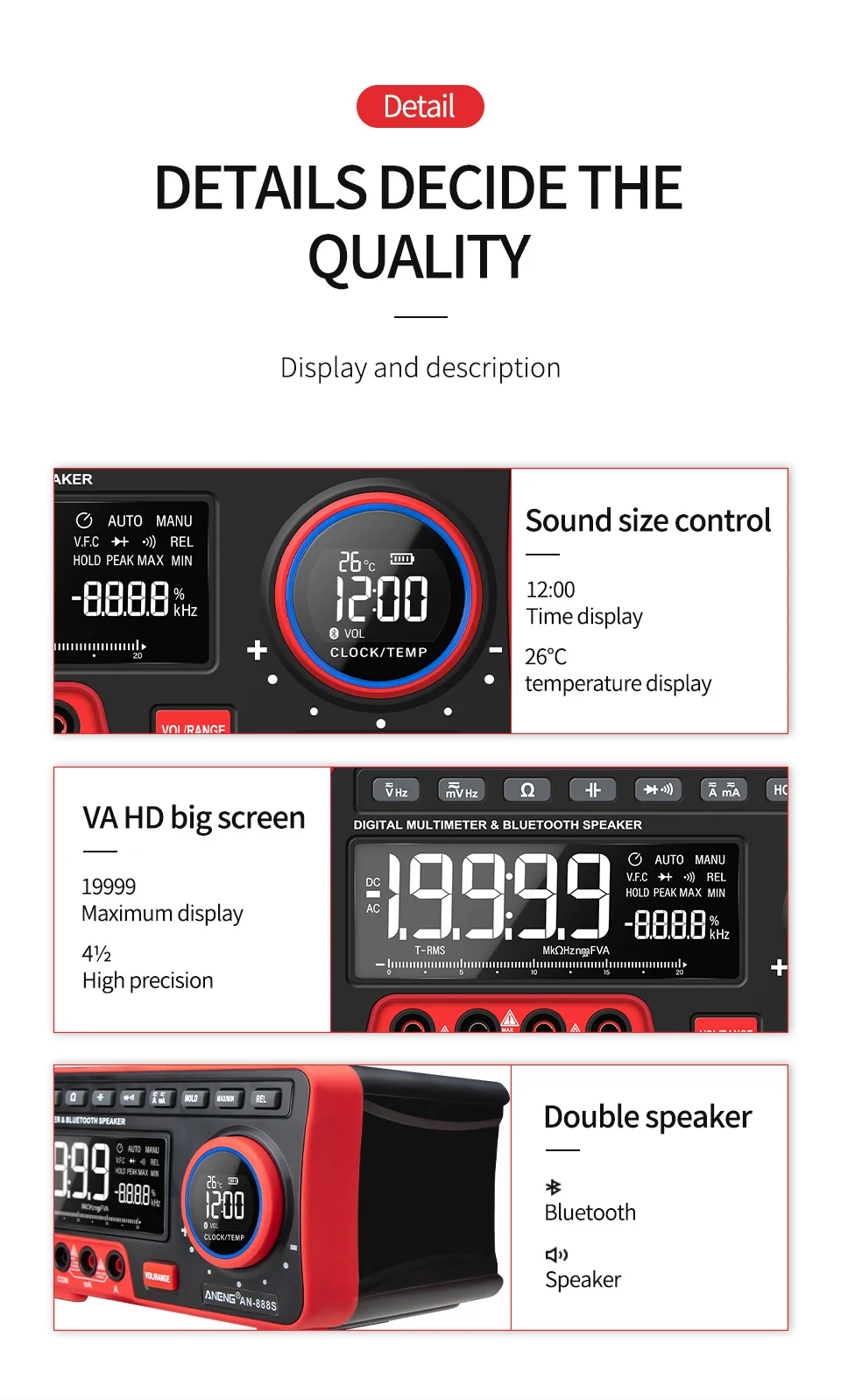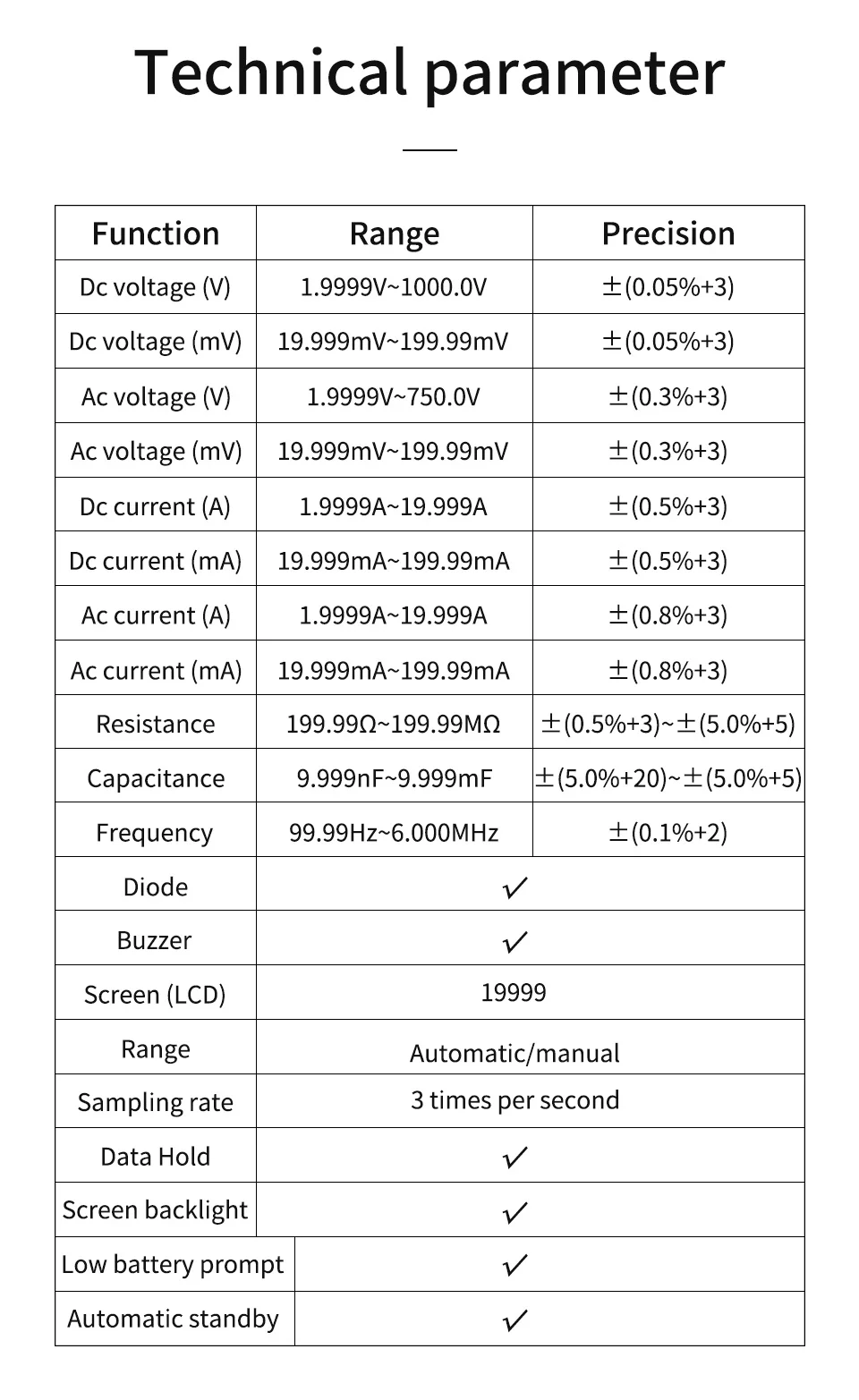 Этот продукт представляет собой автоматический многофункциональный цифровой мультиметр с 19999 высокоточным дисплеем.Счетчик управляется литиевой батареей, с реальным измерением rms, ЖК-дисплеем, регулируемой яркостью подсветки, четким считыванием, часами, будильником, аудио Bluetooth, дисплеем температуры окружающей среды.