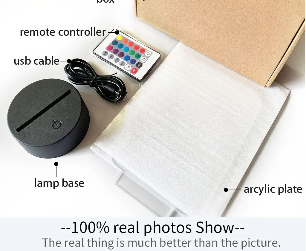 Основные характеристики:Change 7 цветов: красный, зеленый, синий, желтый, голубой, фиолетовый и белыйTouch режим касания: пожалуйста, нажмите кнопку касания один раз, чтобы изменить один цвет, если Нажмите 8 раз, цвета будут изменены автоматически. Удерживайте переключатель вниз в течение 2 секунд, чтобы выключить.Mode режим дистанционного управления: пульт дистанционного управления с включением/выключением, 16 цветов, регулируемая яркость, режим вспышки, плавный режим.❖ Низкое потребление, не будет жарко после долгой работы, светильник использует высококачественный светодиодный светильник, мягкий и равномерный, не ослепляющий, не мерцающий, не повредит глаза.Night ночные светильники для детей, девочек, мальчиков, малышей, женщин. Широко используется в различных условиях, как декоративные светильники для дома, спальни, детской комнаты, гостиной, бара, магазина, кафе, ресторана, вечерние, Клубные и в любом месте. Или в качестве подарочных идей или гаджетов для детей, девочек, мальчиков, малышей, женщин.Параметр:Светильник Материал панели: оптический акрилПотребляемая мощность: 0012 кВт. Ч/24 часаСветодиодный срок службы: 10000 часовМощность: 0,5 WНапряжение: 5 ВСветильник: красный, зеленый, синий, желтый, голубой, фиолетовый, белый (можно зафиксировать один цвет или 7 цветов постепенное изменение)Потребление: 3 ВтИсточник питания: с помощью подключения USB интерфейса или с помощью 3 * AA батарей (не входят в комплект)Посылка: 22 см * 16 см * 6 смПосылка включает в себя:✔1 * Оптическая акриловая панель, размер в 200*150*4 мм✔1 * Основание лампы ABS, размер: 85 85*40 мм✔1 * пульт дистанционного управления✔1 * кабель Micro USB, длина: 1 м✔1 * Руководство пользователяОбратите внимание:● Перед использованием снимите защитную пленку.● Чтобы не оставлять отпечатков пальцев на поверхности акриловой панели, пожалуйста, держите доску только на кромке, а не спереди.Чтобы получить потрясающий ночной Светильник 3D illusion, нажмите кнопку «Добавить в корзину».Настоящая вещь намного лучше, чем на фотографиях!Настоящая вещь намного лучше, чем на фотографиях!Настоящая вещь намного лучше, чем на фотографиях!