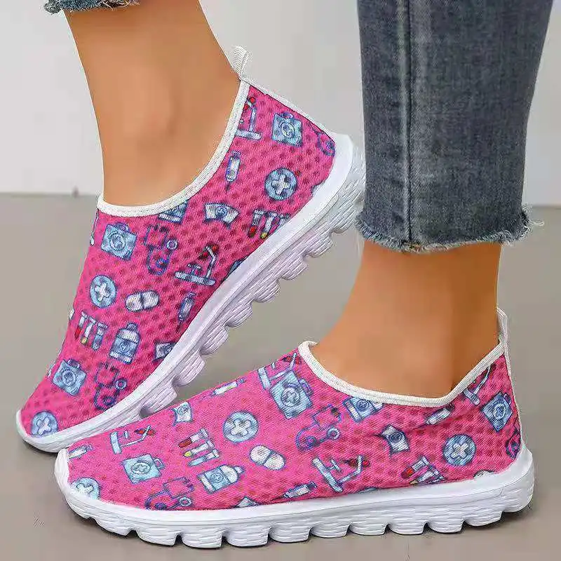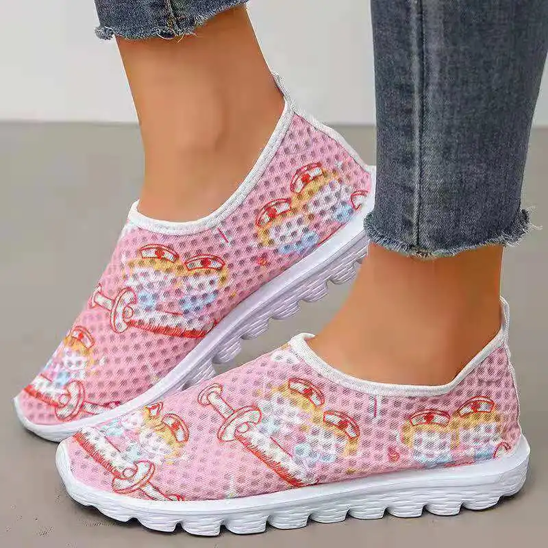 Новинка 2021, Стильная Спортивная дышащая женская обувь большого размера с принтом, сетчатые кроссовки на плоской подошве для бега