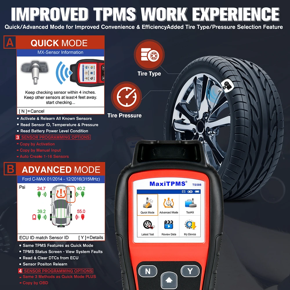 Autel TS508 TPMS relearn инструмент обеспечивает процедуру переобучения на инструменте для каждого TPMS оборудованного США, Азиатский и Европейский автомобиль и помогает вам сбросить систему TPMS независимо от того, что это настоящий датчик OE или aftermarket (после замены датчика s вам нужно повторно узнать датчик TPMS s),TS508 сканер может быстро переосваивать датчик s к транспортному средству с 3 способами, которые являются стационарными, переосваивать, автоматическое переосваивать и переосваивать OBD(TS408 не может сделать).
