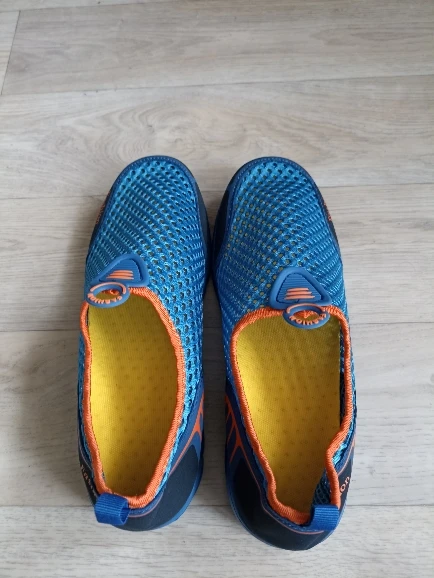 О самой обуви скажу только, что покупаю уже в третий раз. Первые через год забрал дружище-яхтсмен, прыгать по воде и по яхте в них оказалось очень удобно. Водя быстро стекает и ногам комфортно. Я относил их весь сезон. Причём носил как в повседневной жизни, так и выезжал на природу - удивительно, но они неубиваемые, хотя совершенно невесомые и дышащие. Но в третий раз пришли с браком. Тут хочу отметить продавца! Я не стал открывать спор, на написал сообщение продавцу и прикрепил фото. Продавец тут де предложил выслать другую пару. Дошли быстро. В этот раз без недоразумений. Всё отлично! Так что продавцу тоже ***** *Размер выбирайте по таблице. Ничего мудрить не стоит. Они должны сидеть плотно, поэтому при первой примерке может показаться, что на пол размера маловаты - не пугайтесь. Они сядут по ноге. Давить не будут. Если взять на пол размера больше - могут хлябать потом. Так что меряйте аккуратно по таблице.