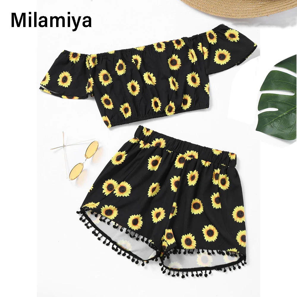 Укороченный топ с принтом подсолнухов на плечах + шорты с кисточками комплект из двух предметов