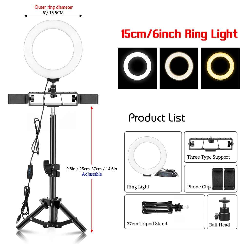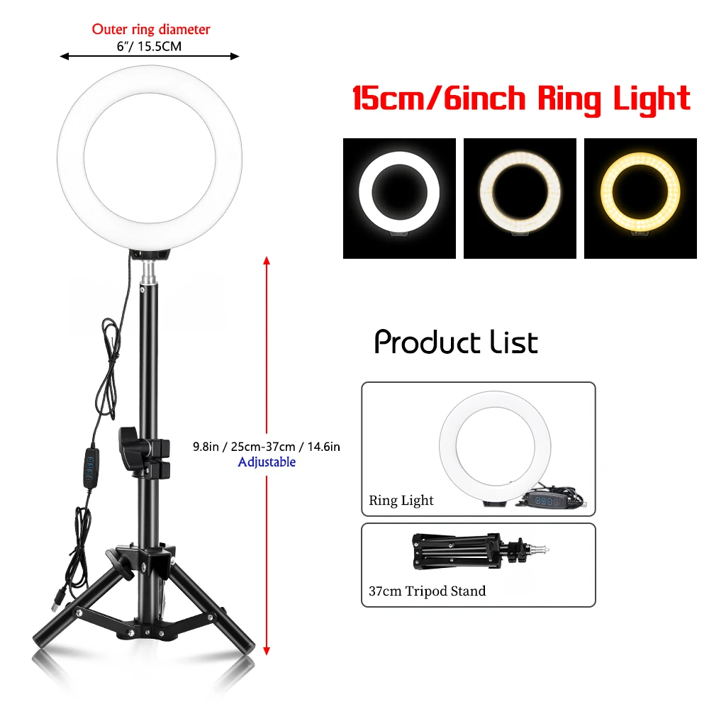 Features 30SH 6inch/16cm Ring Light with 37cm tripod stand
