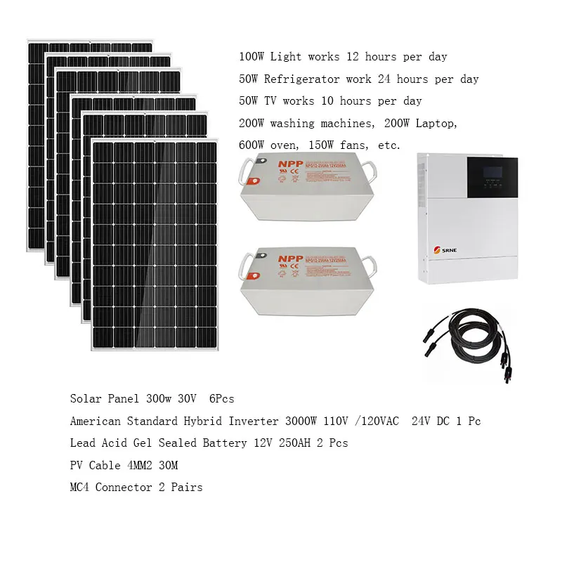 Заказ включает в себя следующие элементы Панели солнечные 300 Вт 30V 6 шт. Американский стандарт Гибридный инвертор 3000 Вт 110 В/120 В переменного тока 24 В постоянного тока 1 шт. Свинцово-кислотные гелиевые герметичный Батарея 12V 250AH комплект из 2 предметов PV кабель 4мм2 30 м Разъем MC4 2 пары Система может работать под бытовой техникой Светильник 100 Вт работает 12 часов в день 50 Вт холодильник работает 24 часа в сутки 50 Вт ТВ работает 10 часов в день 200 Вт стиральные машины, 200 Вт ноутбук, 600 Вт печь, 150 Вт вентиляторы и т. Д.