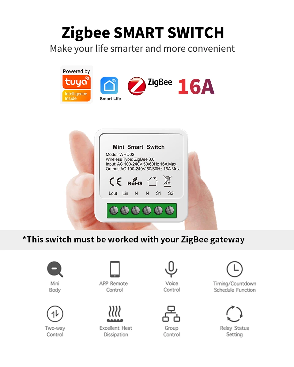 Требуется ступица Tuya ZigBeeКонцентратор Tuya ZigBee является обязательным для мини-smart switch для дистанционного управления приложением и голосового управления. Кроме того, вы можете связать другие продукты Tuya ZigBee с центром для реализации полной системы умного дома для вашего дома.Мини-бодиРазработан 40*40*21 мм мини-корпус, который работает с большинством ящиков, выключателей и настенных розеток.Он не только маленький, но и мощный. Максимальная мощность достигает 1800-3450 Вт, он используется для большинства бытовых приборов и светильников.Поддержка двустороннего управленияЭти умные «сделай сам» может быть использован для вашего старого 2 way переключатель управления. Особенно, вы по-прежнему можете управлять старым переключателем вручную после того, как он был запущен.Пульт дистанционного управления AppОсвещение с дистанционным управлением или приборы вашего дома через приложение Tuya/Smart Life из любого места в любое время. Требуется концентратор.Голосовое управлениеПереключатель ZigBee DIY работает с Alexa и Google Home Assistant, чтобы удобно управлять устройствами с помощью простой голосовой команды, когда вы находитесь в пути.Функция синхронизацииОбновите графики, чтобы автоматически включить/выключить бытовую технику или освещение. Помогает вам экономить энергию и Электрический сбор.Настройка статуса релеНикогда не беспокойтесь о сбое питания, вы можете установить этот переключатель, чтобы восстановить состояние после включения питания.Групповое управлениеУстановите все ваши умные переключатели в группу через приложение smart Life. Затем одним нажатием, чтобы выключить все ваши приборы или светильники смартфоном.Умная сценаСоздание собственной сцены для включения/выключения бытовых приборов в режиме выезда, режим дома, температура, влажность или другие экологические условия.